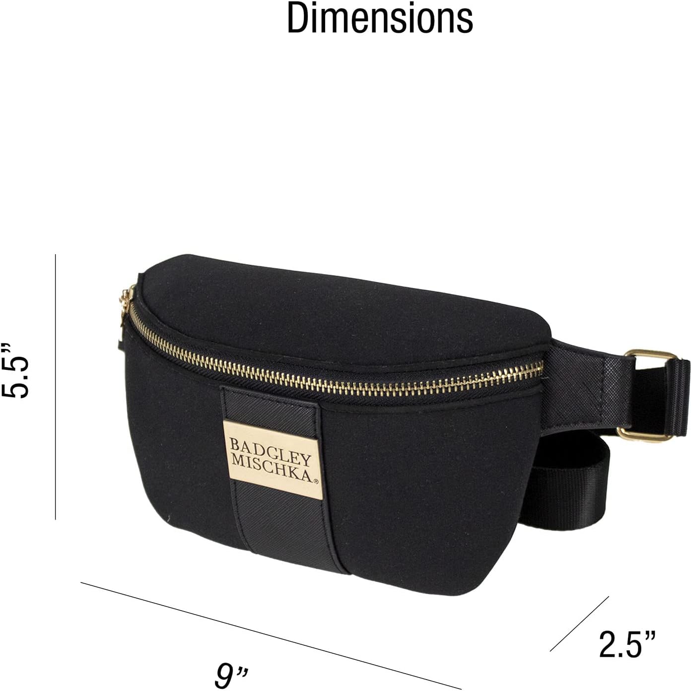 Dimensions 9 x 2.5 x 5.5 inches Weight Approx. 11 ounces Hardware Gold stainless steel Materials Neoprene (scuba), and vegan saffiano leather, nylon, polyester