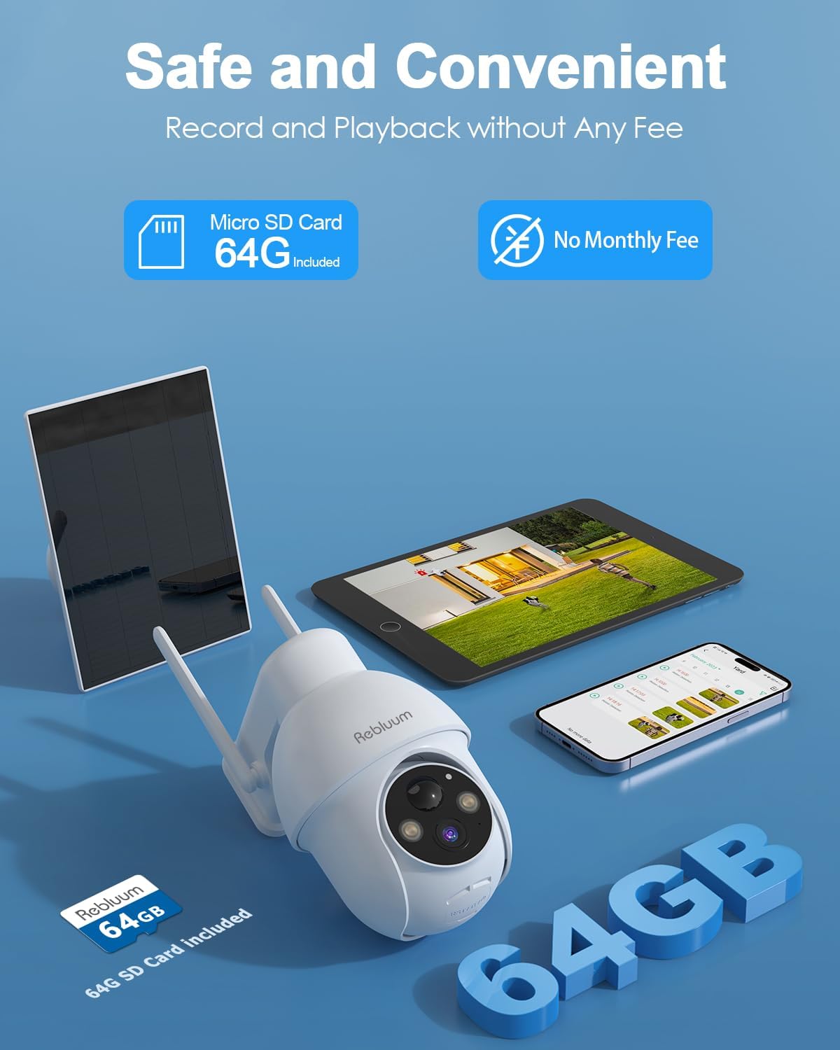 [No Monthly Fee Solar Powered Camera] Rebluum security cameras wireless outdoor comes with 64GB SD card, you don’t need to pay for cloud service for storage. This solar camera security outdoor has a 9700mah battery built in, with high conversion rate solar panel to provide continuous power for outdoor camera wireless. When the solar security camera is turned off, it will automatically switch on with saved power, reducing the camera’s downtime for charging