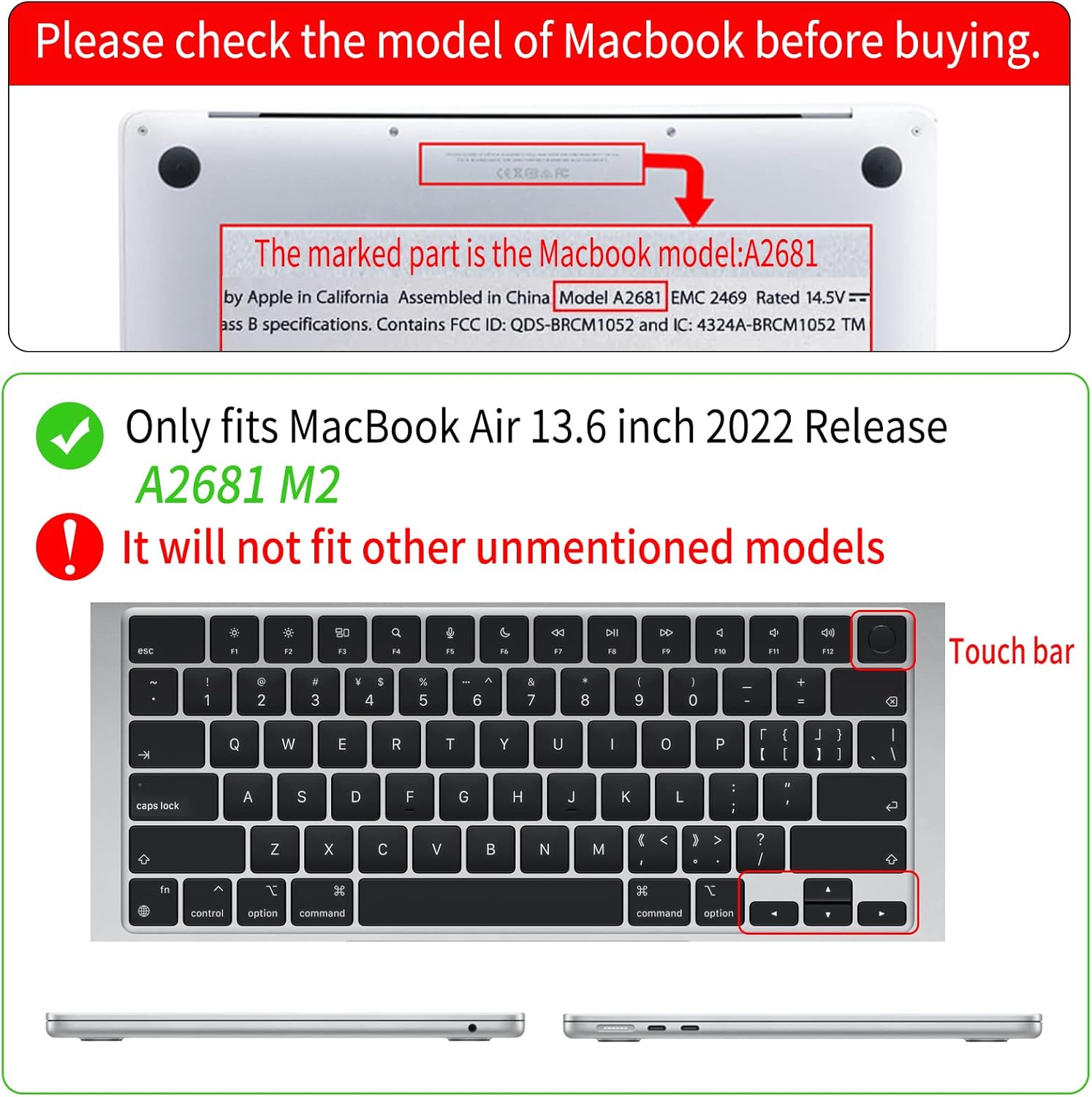 ❤COMPATIBILITY:The case was designed ONLY to be compatible with MacBook Air 13.6 inch M2 Chip with Liquid Retina Display & Touch ID 2022 Release (model: A2681).Please check the model number (AXXXX) at the bottom of your to determine the compatibility and refer to the attached picture to see if the model number is compatible with your Macbook.This case is NOT compatible with other model laptops.