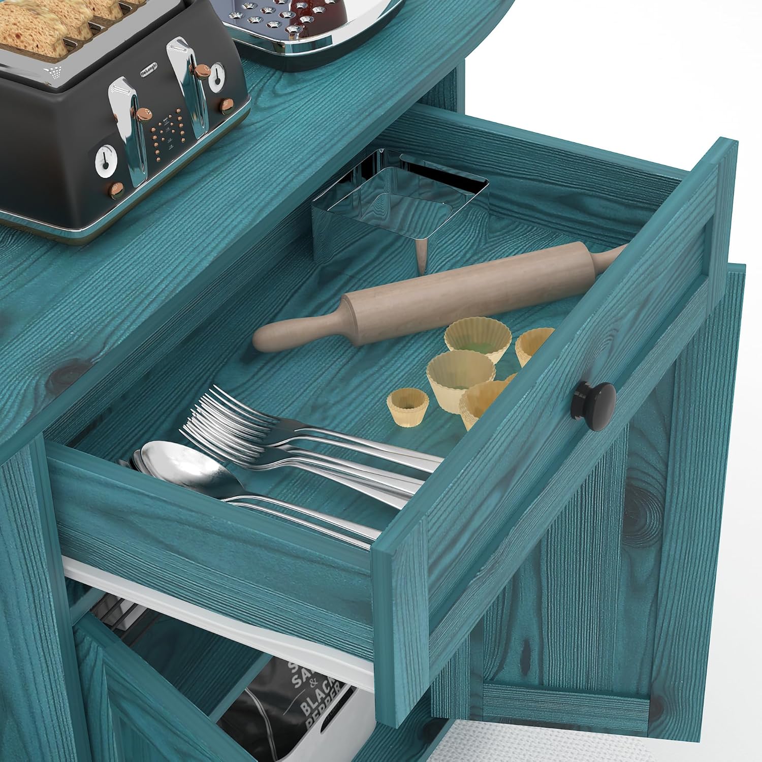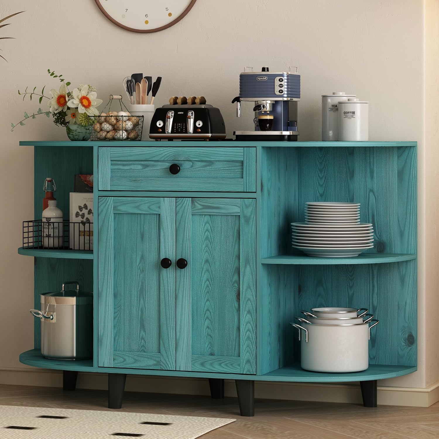 【Eye-catching Look】Retro blue color combination with rounded edge design make this buffet cabinet a perfect complement in your home,which can well integrate into various home decorations and styles. Whether used as a buffet sideboard, storage cupboard or wine bar cabinet, this cupboard is an ideal choice
