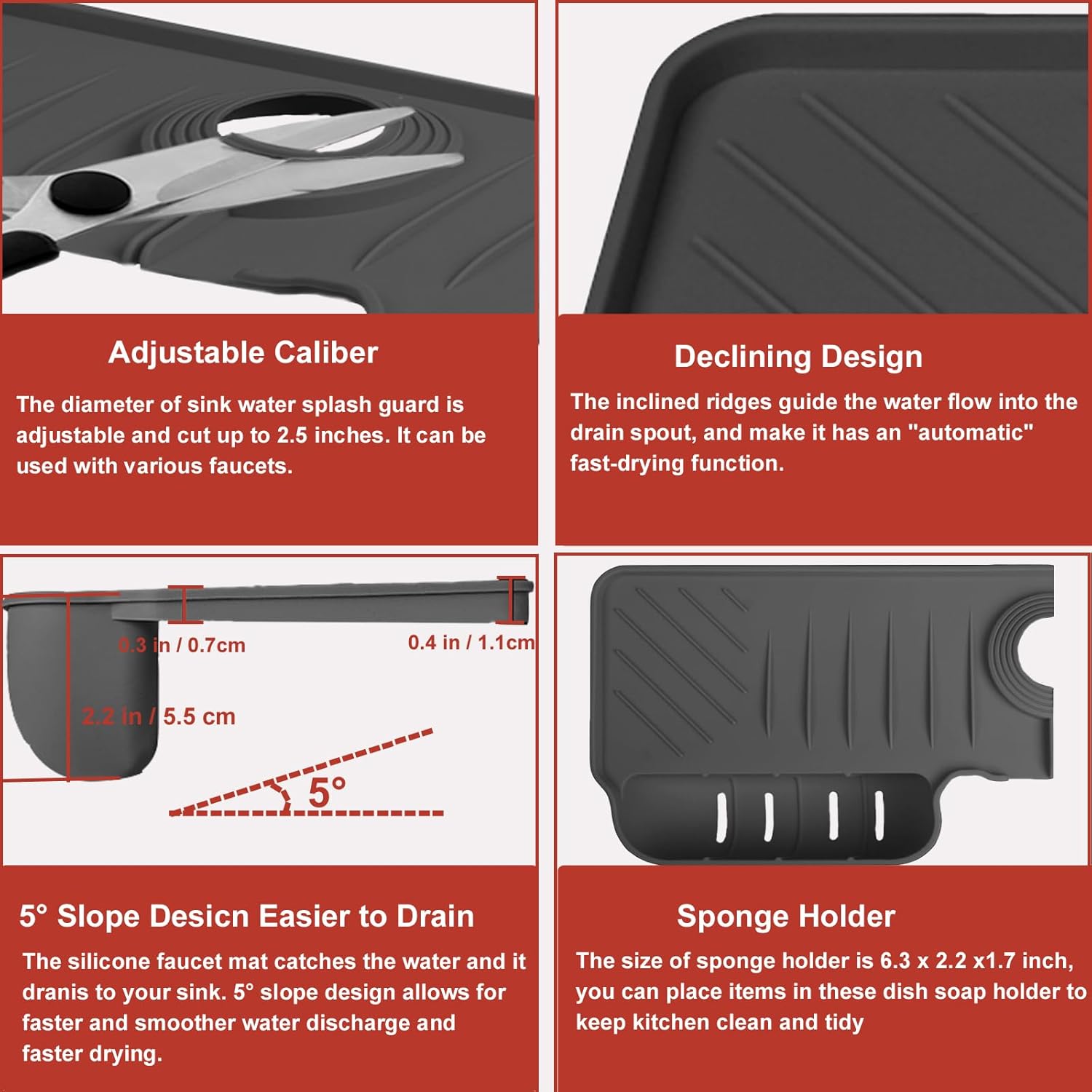Silicone Faucet Splash Guard Mat, Faucet Water Catcher Mat Silicone Sink Mat Tray Drying Mat, Dish Sponge Holder, Home Kitchen Sink Accessory Gadgets Organizer-Black