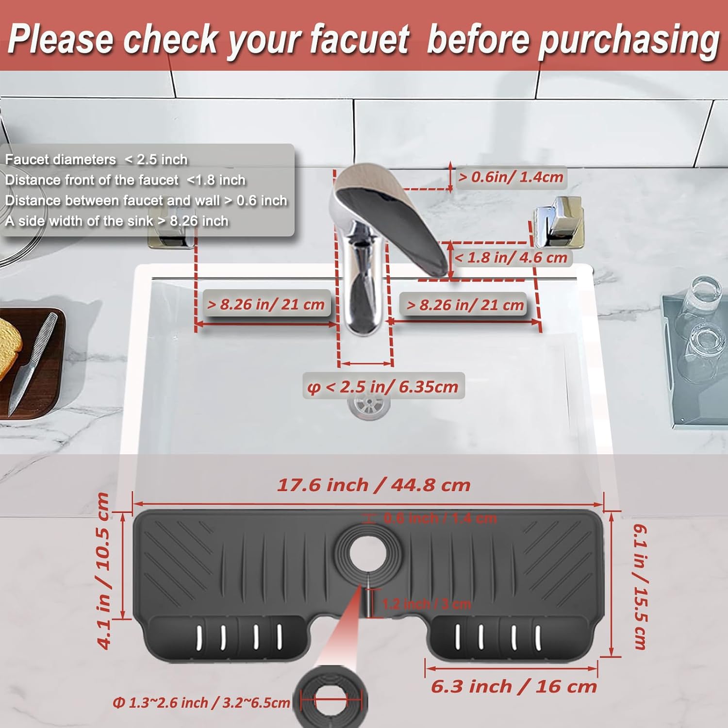 【Perfect Fit for Your Sink】17.6″ x 6.1″ / 44.8 x15.5 CM, diameter single faucet hole 2.6″(6.5cm). Automatically drains the water in the faucet water catcher mat with drain into the sink,Remove water stains,no water accumulation keep dry.Don’t worry about sink splash guard need takes a lot of time to dry.