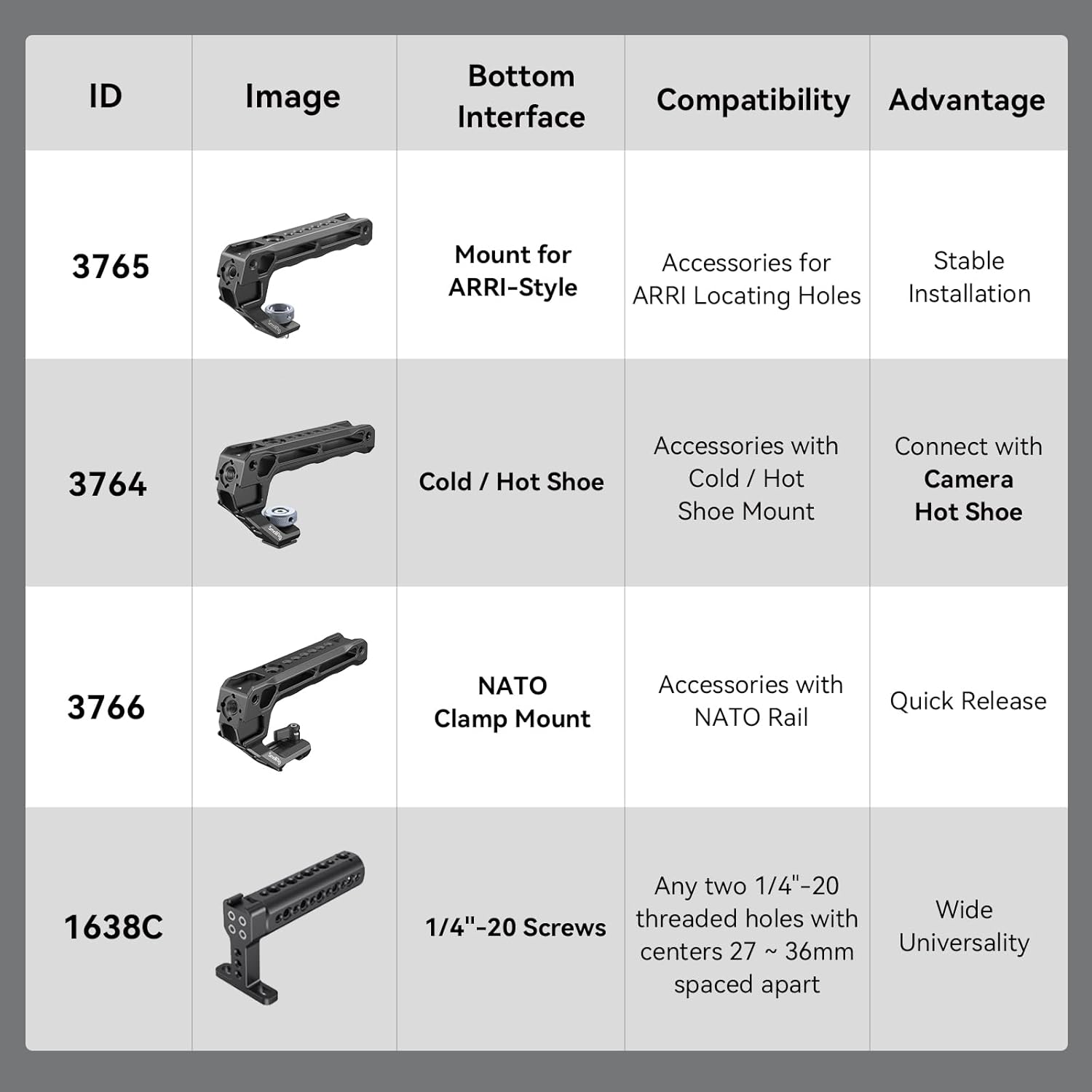 Compatibility : SMALLRIG Top Handle with Locating Holes for ARRI 3765 is designed to facilitate low-angle shot and reduce burdens on arms, compatibility for Universal cold/hot shoe mount