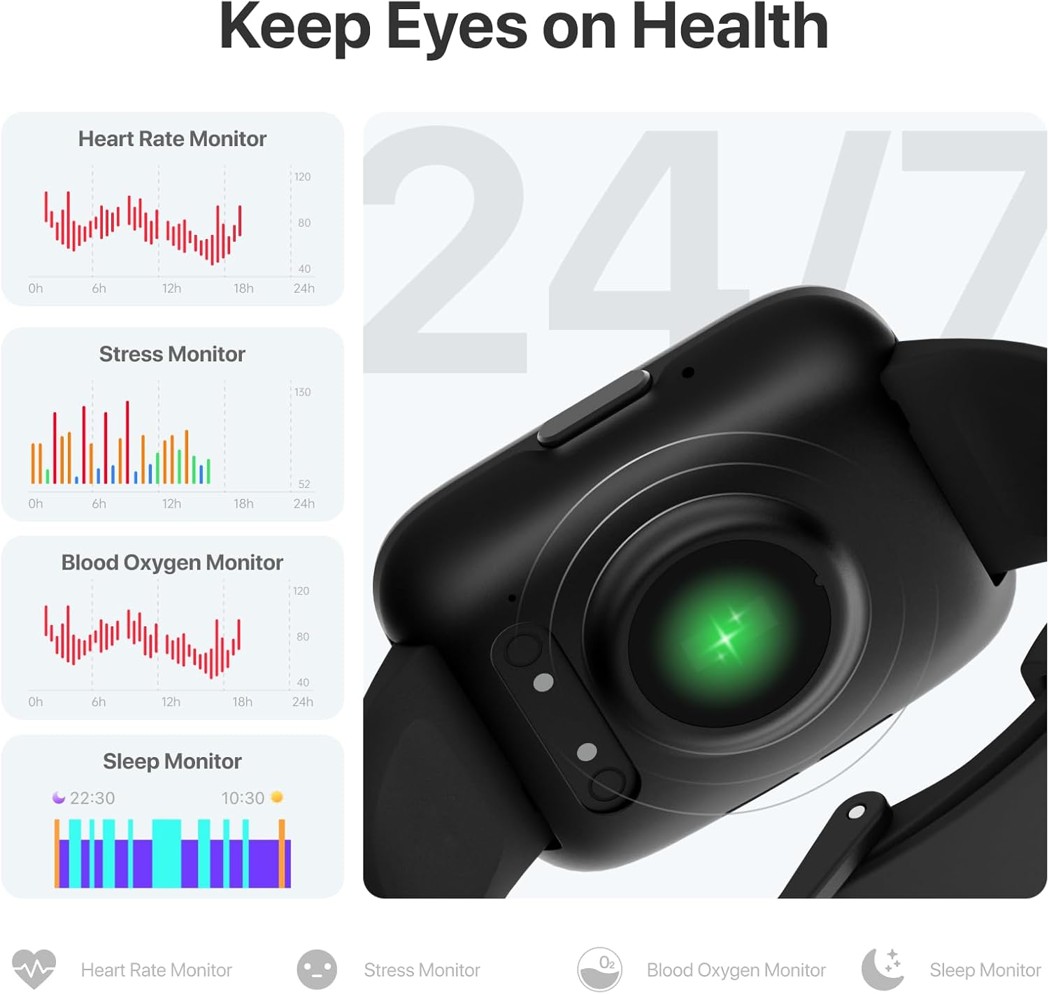 ALL-DAY ACTIVITY TRACKER — Watch your well-being with around-the-clock health watch with a heart rate monitor and blood oxygen monitor. Keep an eye on your stress level. Get notifications if you have an irregular rhythm in your workout. And see how much time you spent in REM, Core, or Deep sleep with Sleep Stages. Stay in sync with your menstrual cycle.
