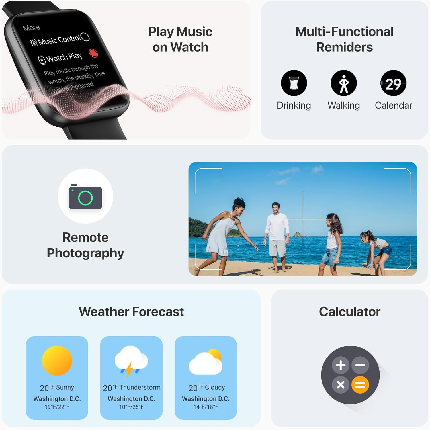 TOOLS FROM YOUR WRIST — The fitness watch has multiple useful tools: a calculator, breath training, alarm, weather, event Reminder, cycling tracker, stopwatch, timer, music control, camera control, find my phone, and so on.