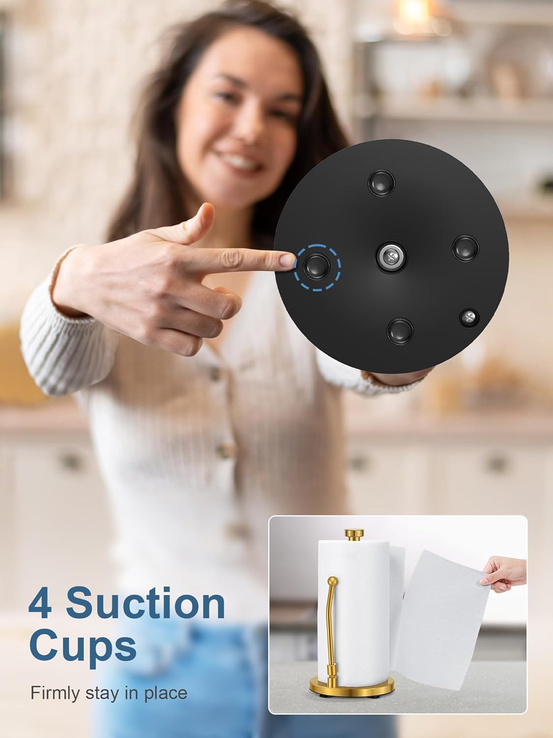 Suction Cups Design: Equipped with 4 suction cups under the base, ensuring a firm grip on countertops, dinner tables, etc. Avoids sliding and skidding, a must-have standing paper towel holder for your home.