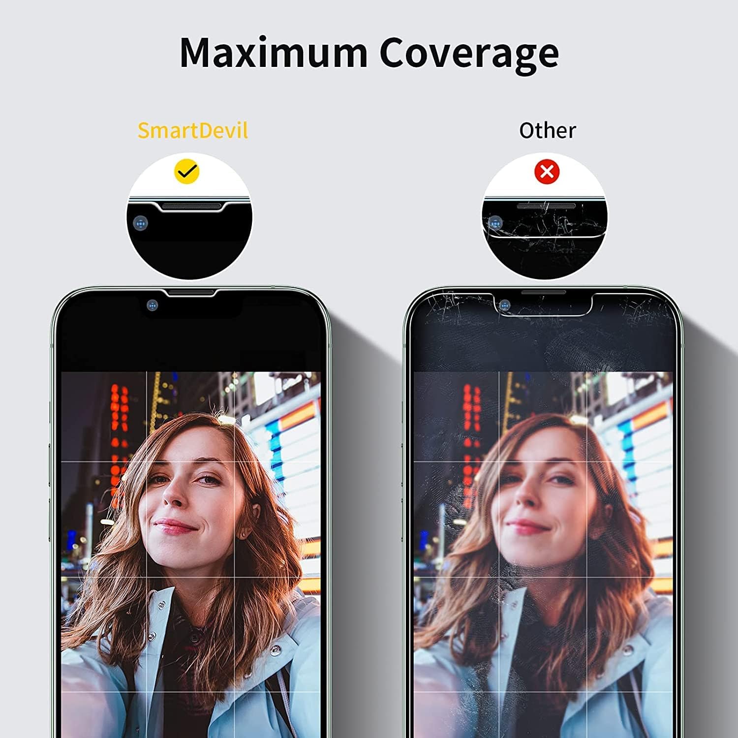 【EASY TO INSTALL】: With breakthrough uniquely electrostatic edges adsorption technology, SmartDevil tempered glass for iPhone 14/iPhone 13/13 Pro can fit perfectly in just 4 seconds, and quickly exhaust to 0 BUBBLES. Unlike others with loose edges that easily cause air bubbles. Even beginners, seniors and toddler can look like professionals.