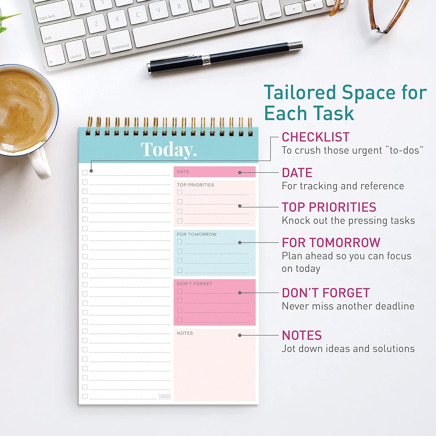 Divide and Conquer –– This daily checklist planner has plenty of space and different categories to sort your thoughts. Set tomorrow’s tasks aside and decide what’s really pressing today. The daily planner undated design means you can be your most productive self, no matter what day you decide to begin