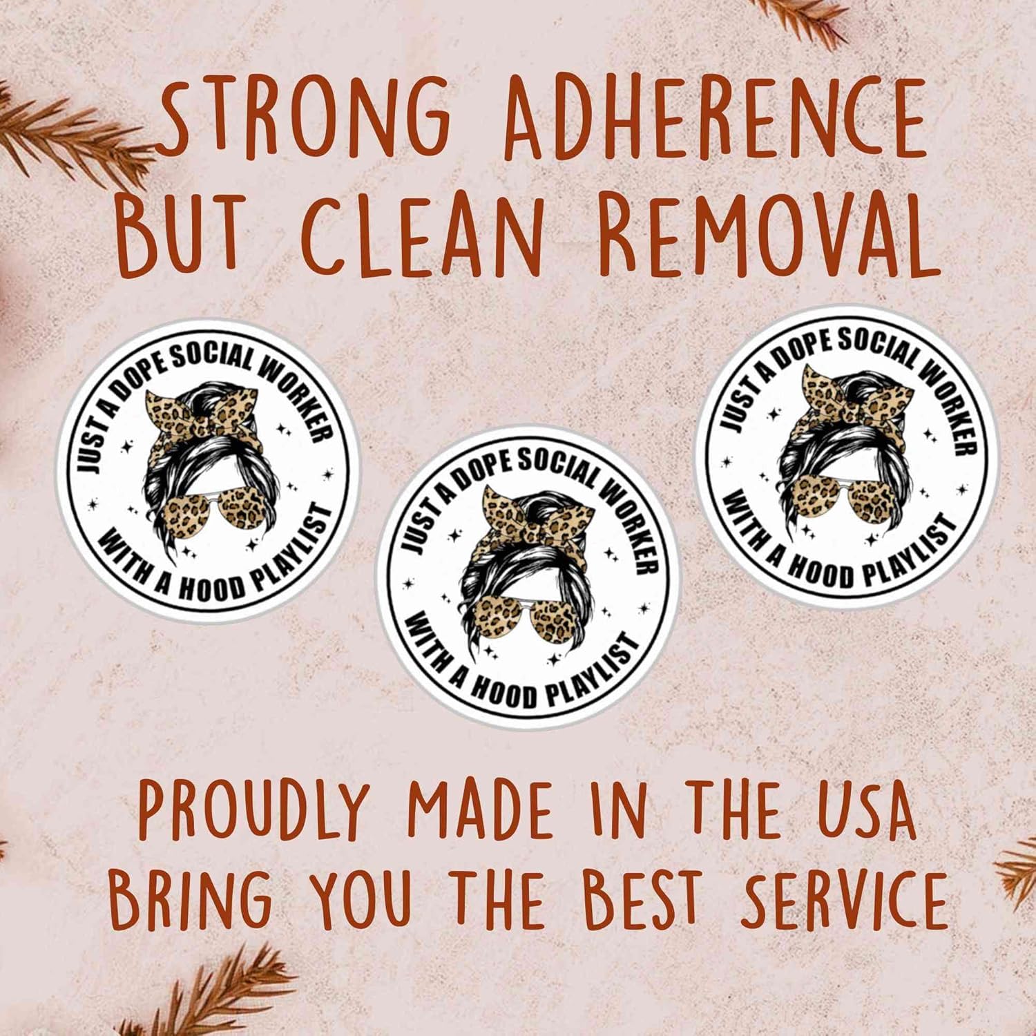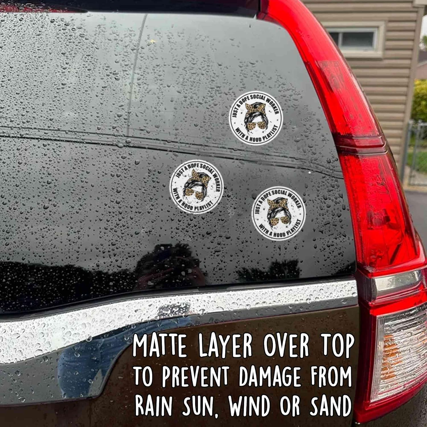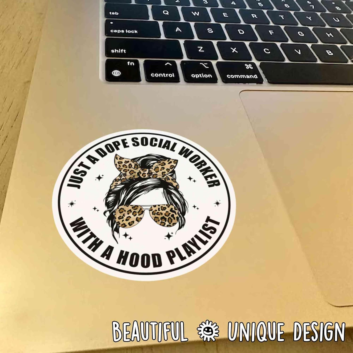 Social Worker Sticker Just A Social Worker with A Hood Playlist Messy Bun Leopard Circle Weather-Resistant Sticker for Water Bottles, Laptop, Window, Car Size 3″”