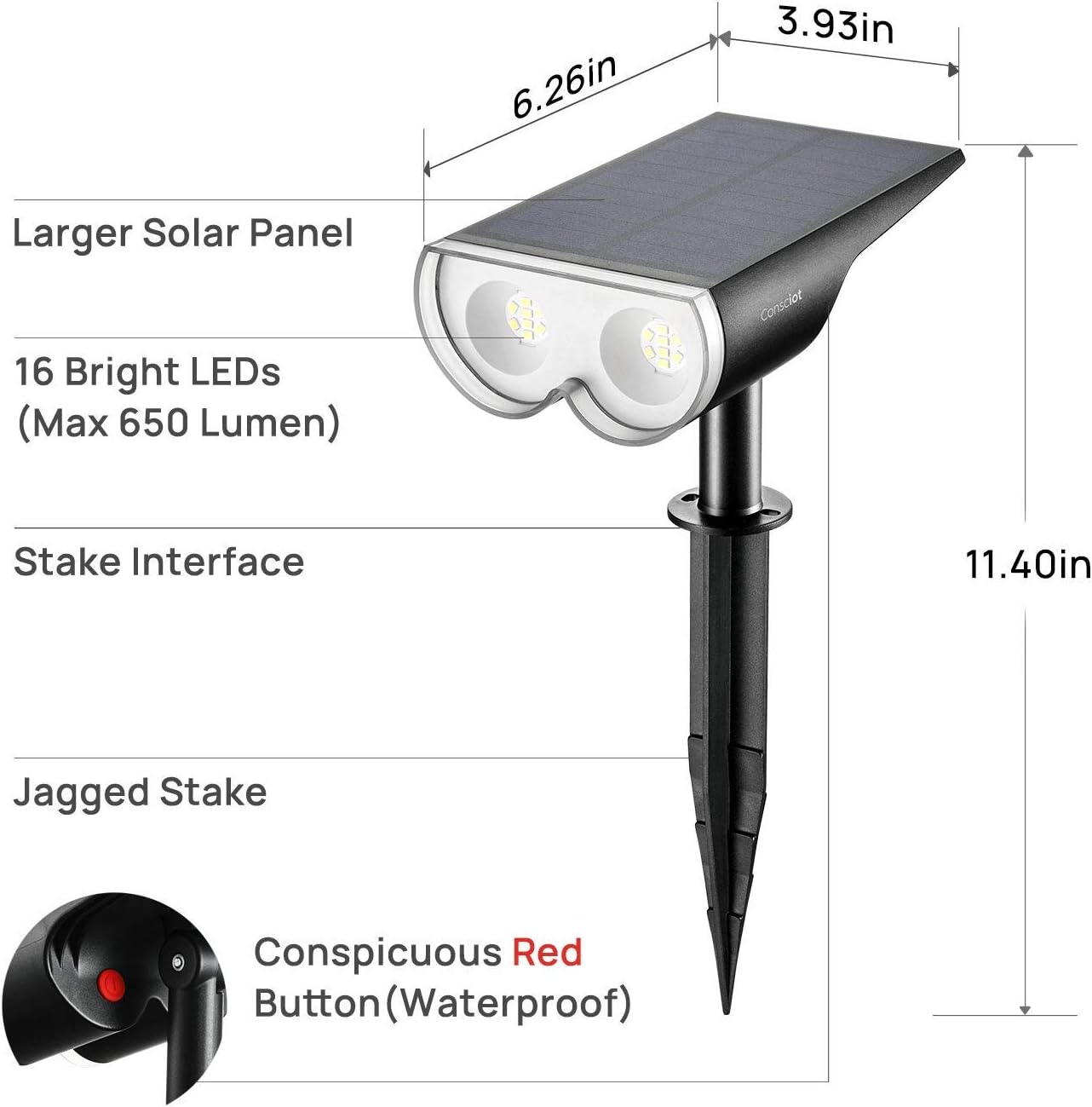 ✨Consciot 16 LEDs Solar Spot Lights✨ ❤️Cool White 6500K ❤️2 Pack ❤️2 Lighting Modes: Low Light Mode(12hrs) / High Light Mode(6hrs) ❤️Auto On/Off from Dusk to Dawn ❤️Wireless Solar Powered ❤️90° vertically or 180° horizontally Adjustable ❤️Working Temperature: -20°C-50°C ❤️Anti-UV ABS ❤️Beam Angle: 90 ° ❤️IP67 Waterproof ❤️2-in-1 Installation ❤️ Ideal for decorating the Garden, Pathway, Driveways, Yard, Pool, Patio, Porch and more…
