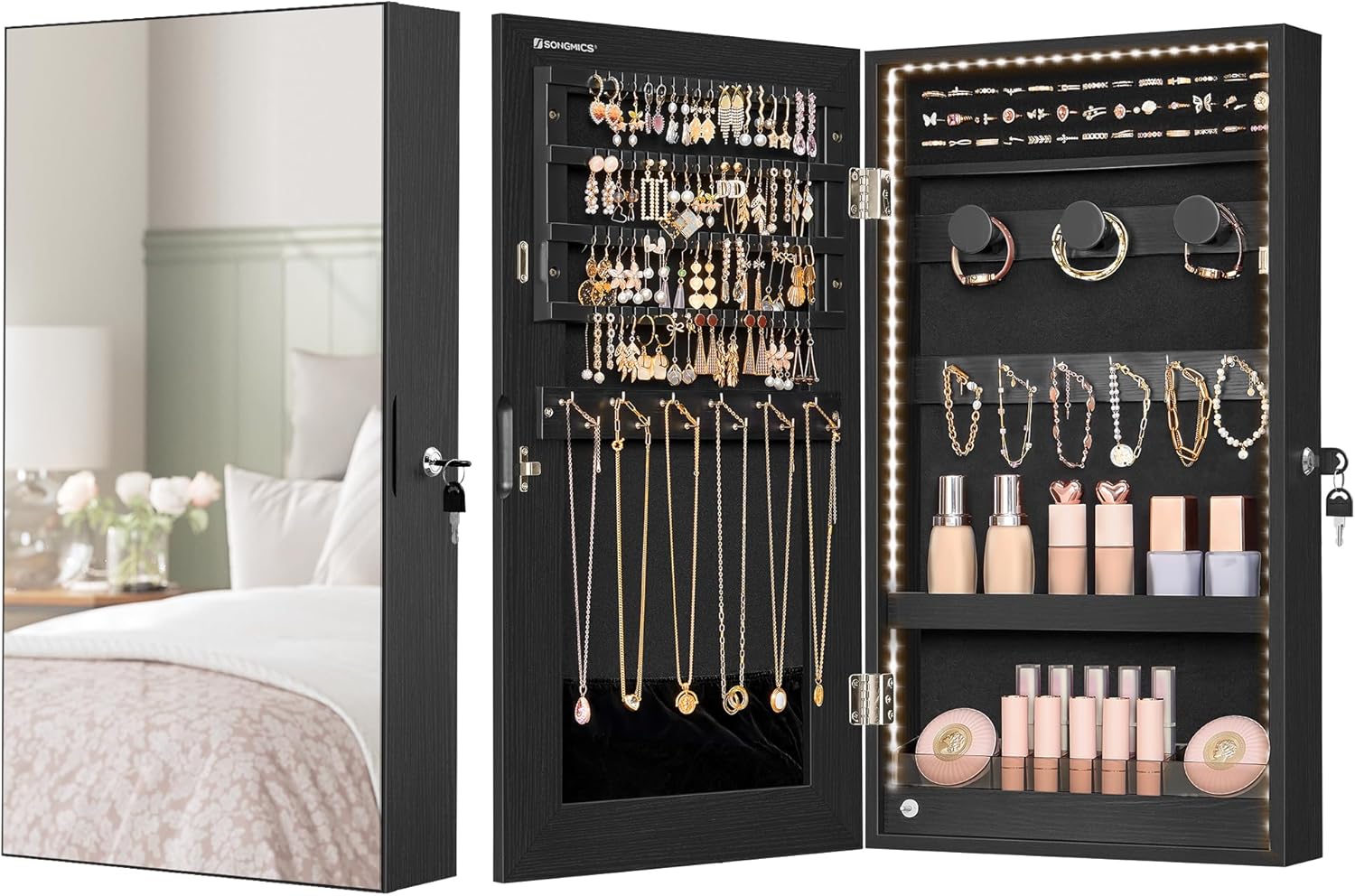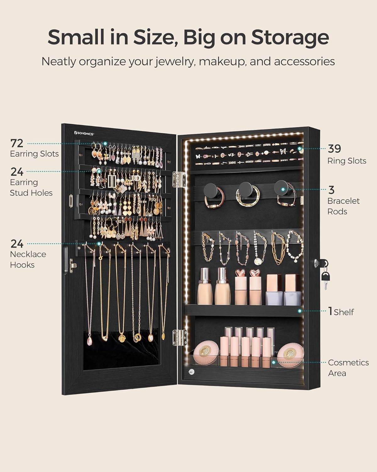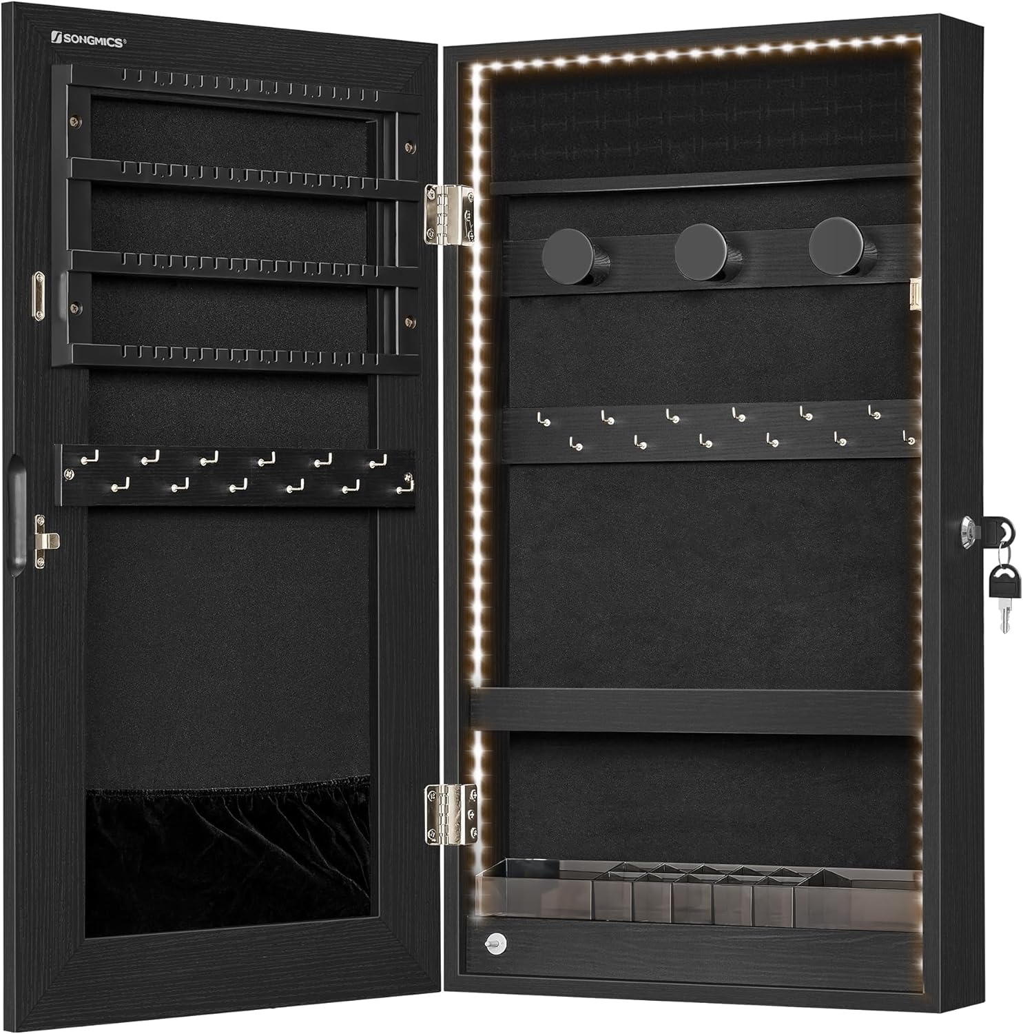 SONGMICS Mirror Jewelry Cabinet Armoire with Built-in LED Lights, Wall or Door Mounted Jewelry Storage Organizer, 3.8 x 14.6 x 26.4 Inches Hanging Mirror Cabinet, Gift Idea, Black UJJC050B01