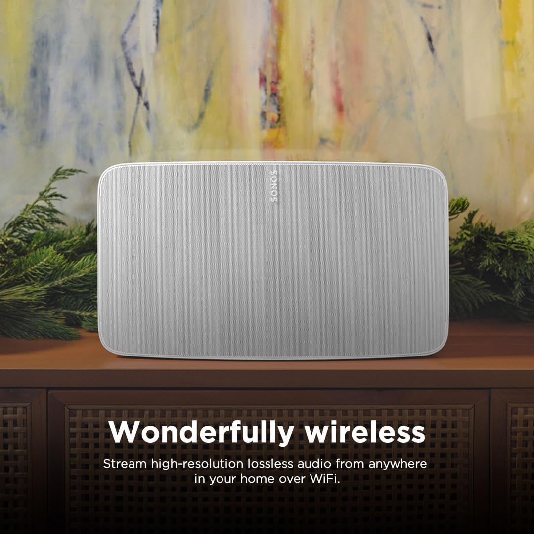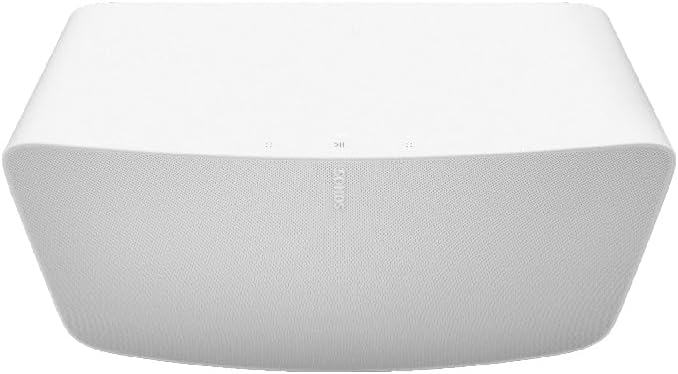 Experience vividly clear, room-filling sound for music and more with the all-new Sonos Five, tuned by renowned producer Giles Martin. Enjoy control with the Sonos app, Apple AirPlay 2, and more. Five’s unrivalled acoustic design features three high-excursion woofers within a sealed architecture that eliminates reverb and echo.Two precisely-angled side tweeters create spatial extension and rich stereo sound, while a center tweeter optimizes vocal playback. Place a single speaker horizontally for stereo sound. Pair two speakers in an upright position and each automatically adjusts to mono for more detailed stereo separation and an even wider soundstage. Connect your turntable, CD player, or other device directly to Five using the 3.5 millimeter line-in port. Trueplay puts the speaker-tuning capability of the pros in the palm of your hands, adapting and optimizing the sound of the speaker to the unique acoustics of the room.