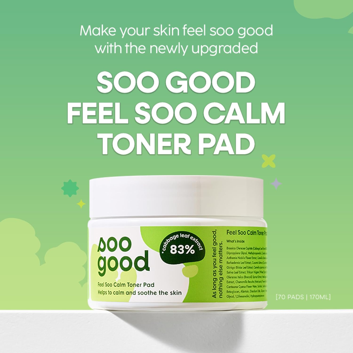 SOO Good Feel Soo Calm Pure Cotton Toner Pads 70 w/83% Cabbage Centella Asiatica Azulene – Sensitive Skin Soothe Pore & Sebum Control Korean Skincare