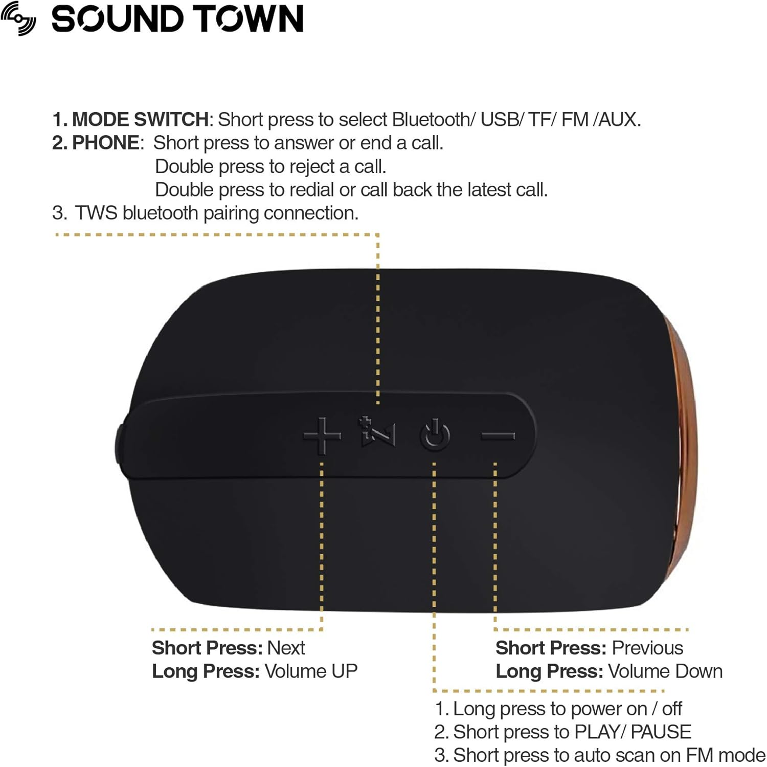 TWS & EFFORTLESS PAIRING: The combo includes two Sound Town X6 speakers. The X6 Bluetooth speaker comes with True Wireless Stereo (TWS) function and allows you to pair your Bluetooth enabled device with two X6 speakers at the same time for 360° surround sound and optimal coverage; Bluetooth 5.0 ensures immediate pairing and maintains a strong connection up to 100 feet