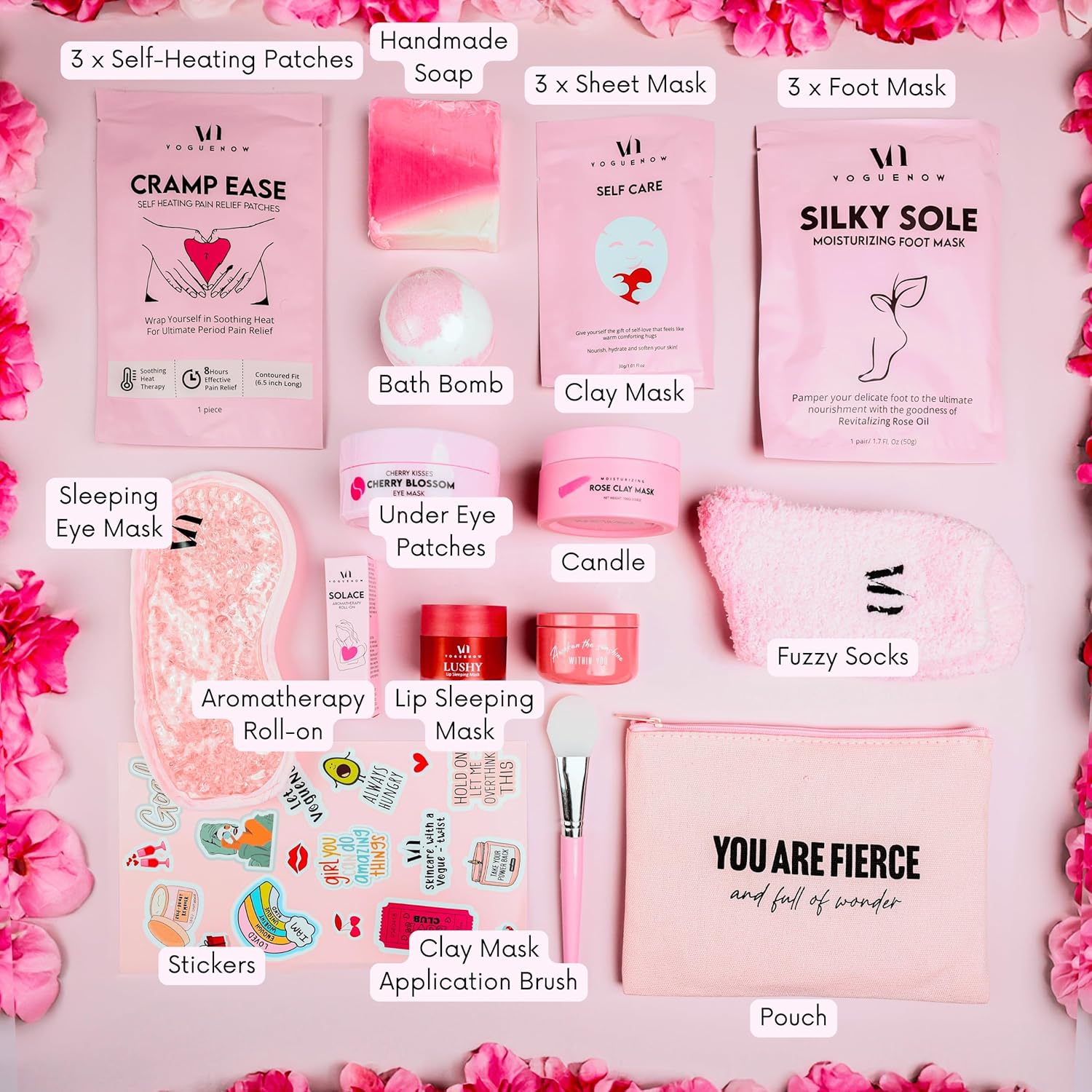 ✨ WHATS INCLUDED IN THE BOX?: This wholesome set consists of 22 skincare and self care items for women – 1 x Clay Mask with application brush, 1 x Under Patches, 1 x Lip Mask with Application Brush, 3 x Face Sheet Mask, 3 x Foot Mask, 1 x Pair of Fuzzy Socks, 3 x Self Heating Patches, 1 x Scented Candle, 1 x Bath Bomb, 1 x Soap, 1 x Aromatherapy Roll-on and 1 x Sleeping Eye Mask. It includes an adorable pouch and stickers too!