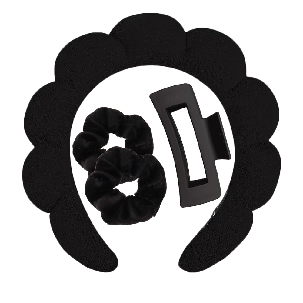 Spa Headband and Wristband Set for Women Girls, Skin Care Headband for Washing Face – Hair Clip Scrunchies Makeup Headbands Terry Cloth Sponge Puffy, Makeup Hair Accessories – Black