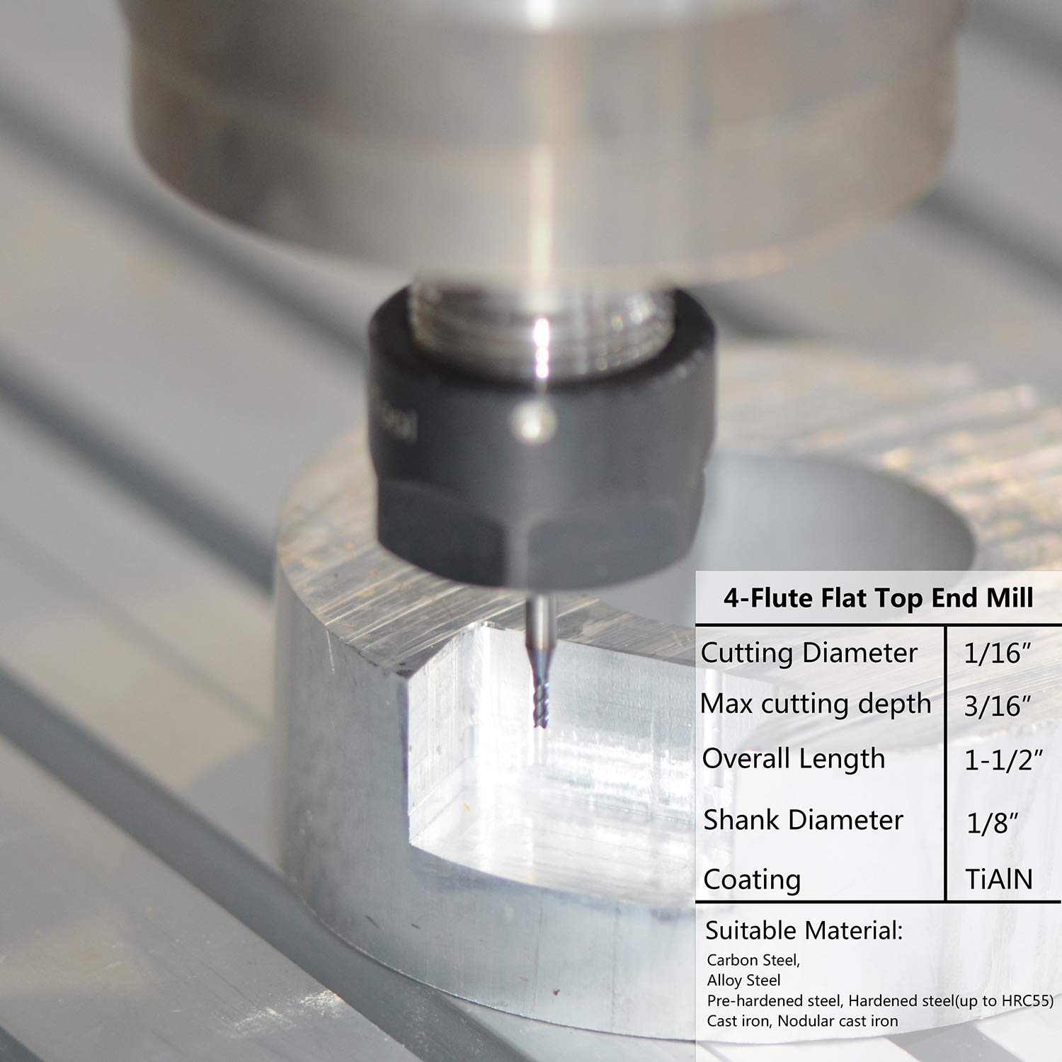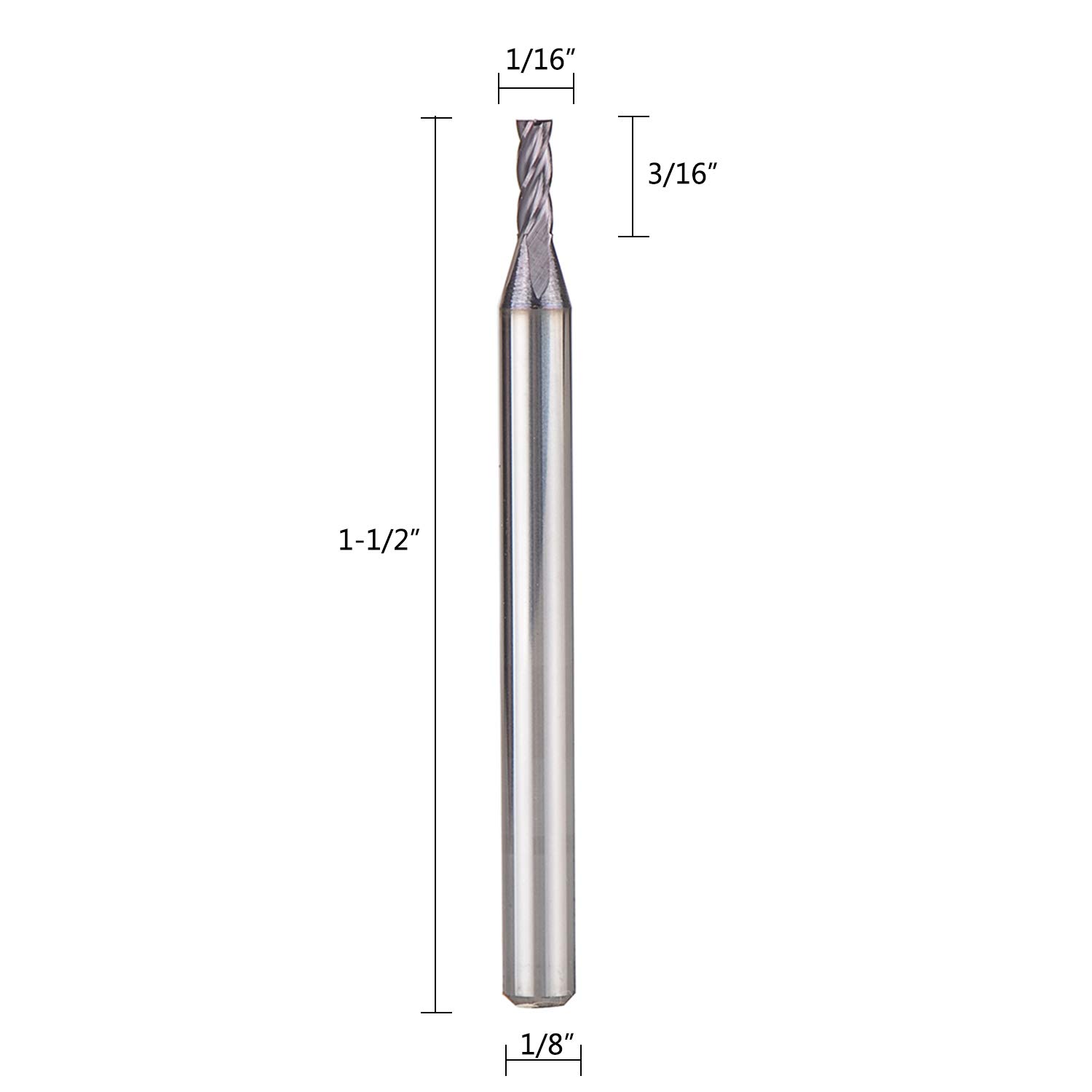 Solid Carbide Spiral Router Bit with 1/8 inch Shank and 1/16 inch Cutting Diameter, 3/16 inch Cutting Length, 1-1/2 inch for Total Length; Flat Top with 4-Flute, Material: HRC55 Carbide with TiAlN Coated; For CNC, Engraving Machine.Carbon Steel, Mould Steel, Inconel, Stainless Steel, Titanium Alloy etc; The Route Bit Suit for CNC Router and Makita, Bosch, and Any Brand Plunge Router with 1/8″ Collet; End Mill Bits are Suitable for Side Milling, End Milling, Finish Machining, etc.;