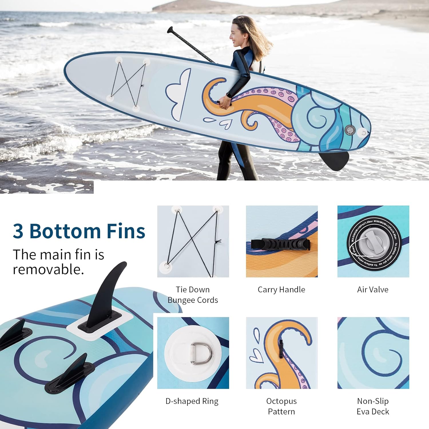 【🏄SUP and Kayak 2-in-1 Design】Designed with extra 4 D-rings, it can be used as a SUP board for long distance adventure or as a kayak for recreation. Equipped with triple bottom fins, steering and maneuvering the vertical inflatable paddle is very easy. Offering special surf control, you will glide and skate through the water like a sea creature!