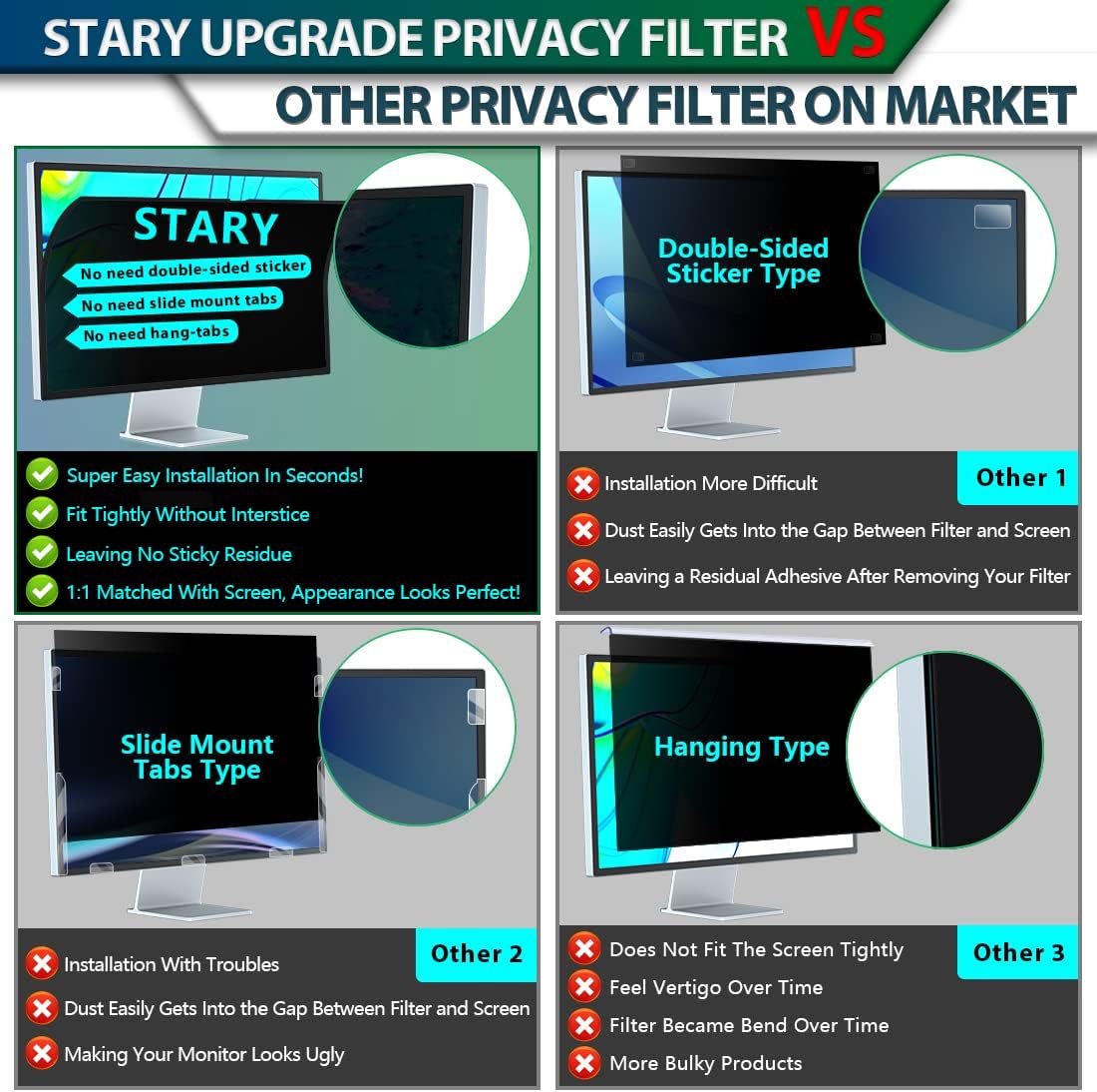 【 Upgraded Installation & No Mess 】- Stary privacy screen Studio display 27 inch is fully upgraded, no need plastic tabs or tape to hold the privacy screen in place. Forget screens that leave a sticky residue when you pull them off and then stop working after a few times removed. Our filter will automatically attach to the bezel area of the display edge smoothly, quickly and seamlessly. It can stay firmly on the screen, also it supports take down/on as need, leaving no sticky residue.