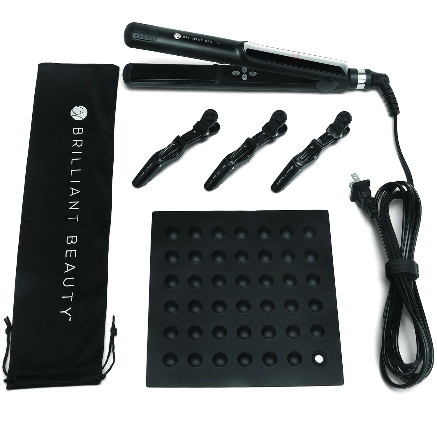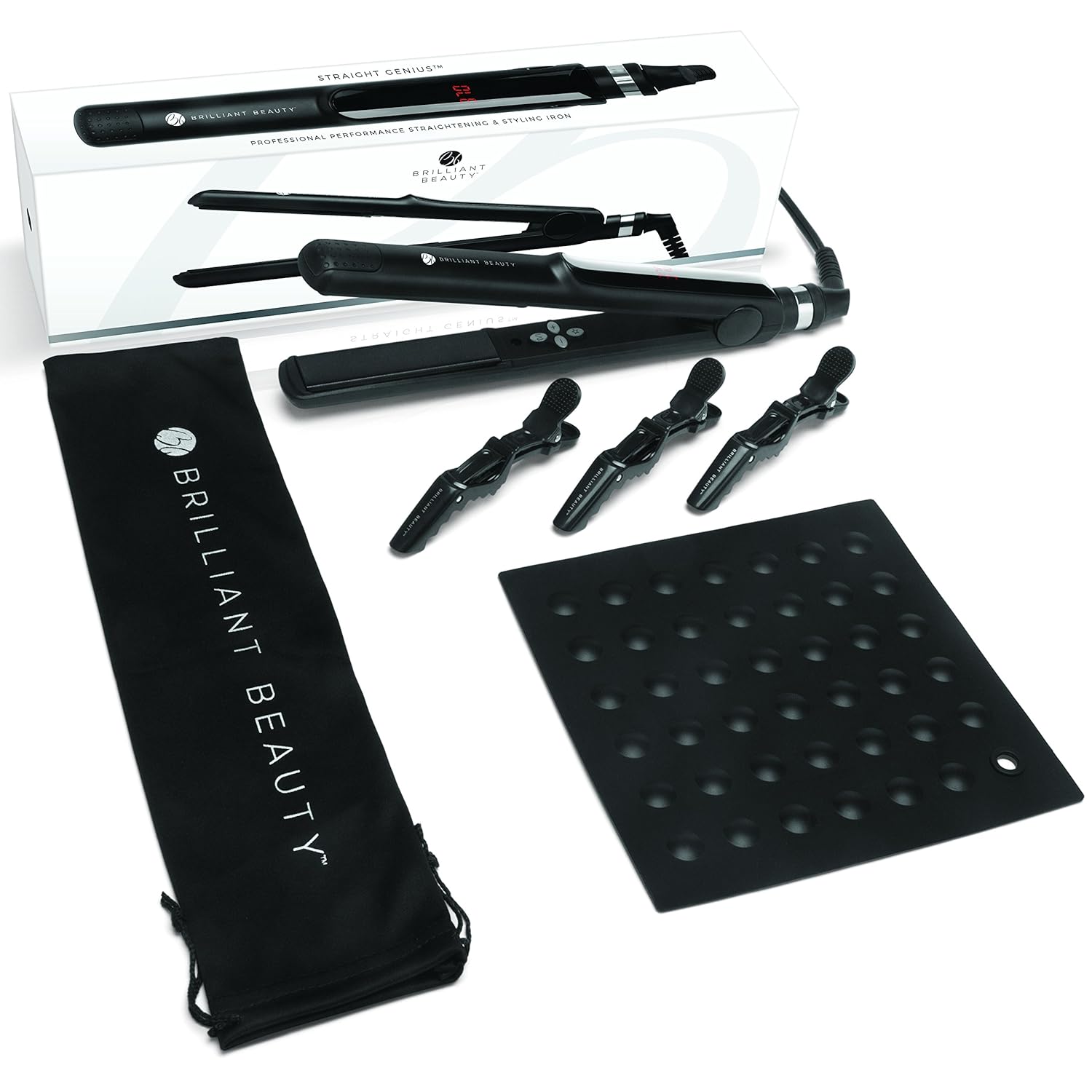 UNIVERSAL SET: Comes with a heat resistant silicone mat that is the perfect resting place for your Straight Genius, three durable clips to help section your hair, and a luxurious travel bag to keep your straightener safe and protected.