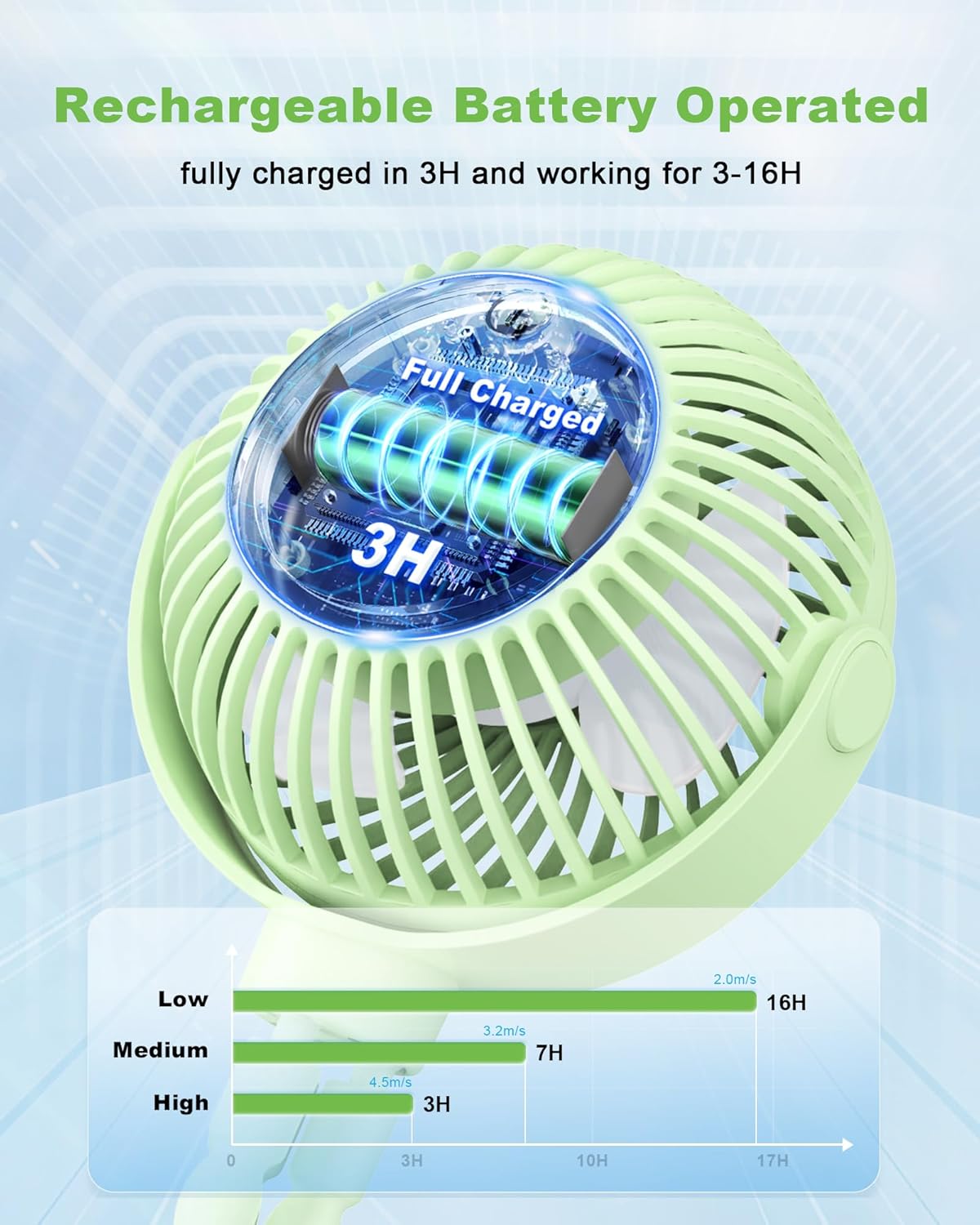 The portable fan is practical in daily life: 1. Stand on the table as a desk fan for work/ read/ study; 2. Hand as a handheld fan for travel/ shopping/ music show; 3. Wind as stroller fan/ crib fan/ golf cart fan/ car seat fan/ bike fan; 4. Hung on the tent as a camping fan/ beach fan;