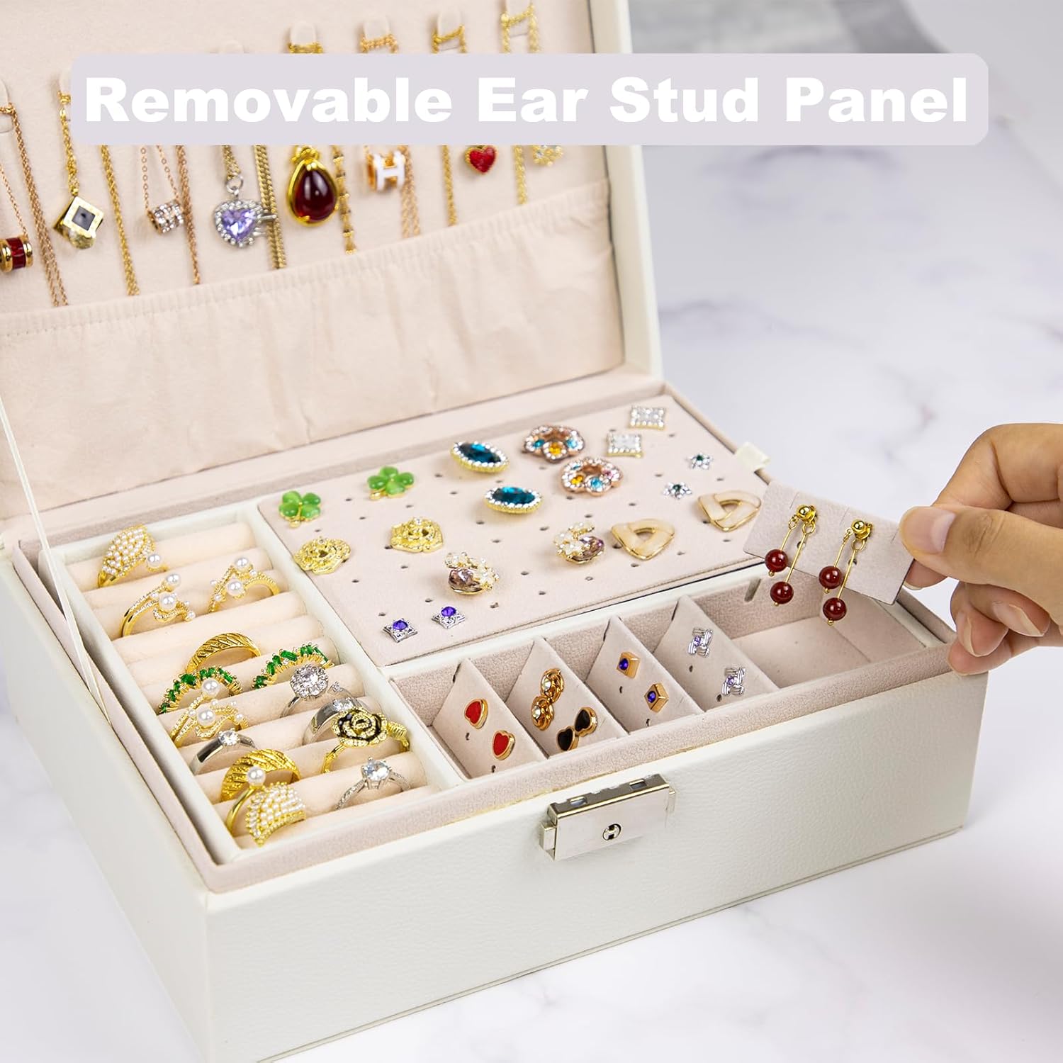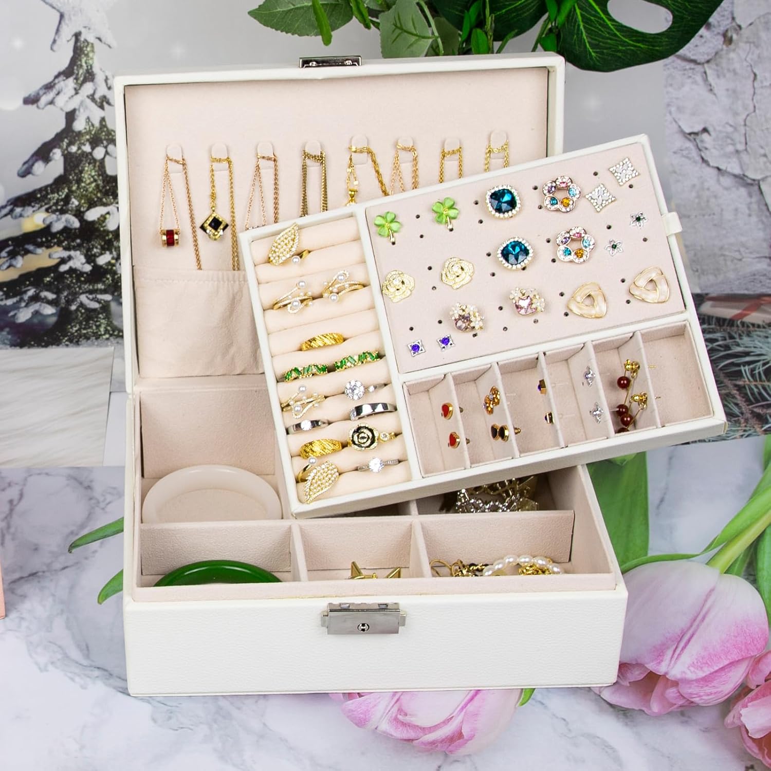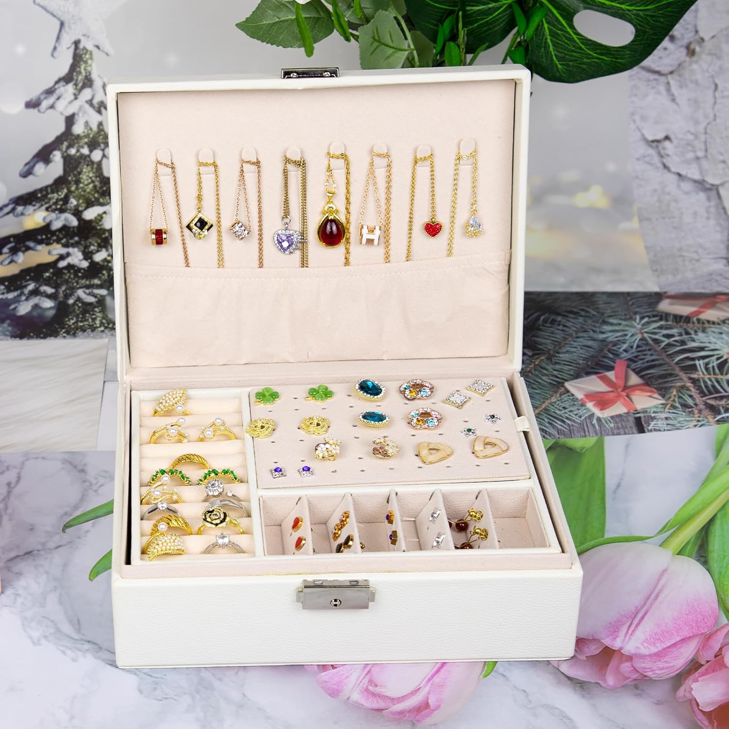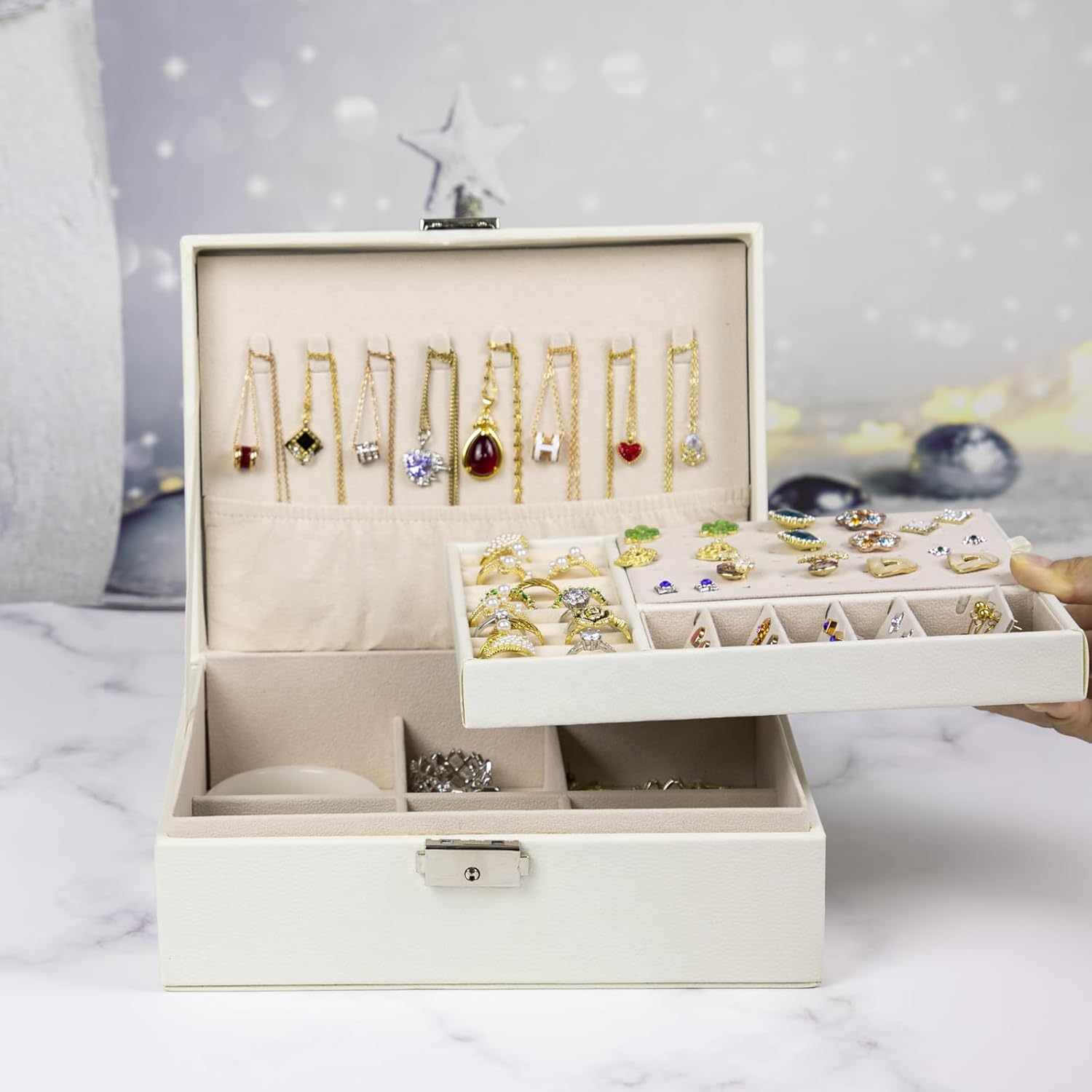 SYCARON Jewelry Box Organizer for Women, Jewelry Organizers 2 Layer Jewelry Storage Box PU Leather with Lock for Women Girls Rings Earrings Necklace Bracelets, Off White