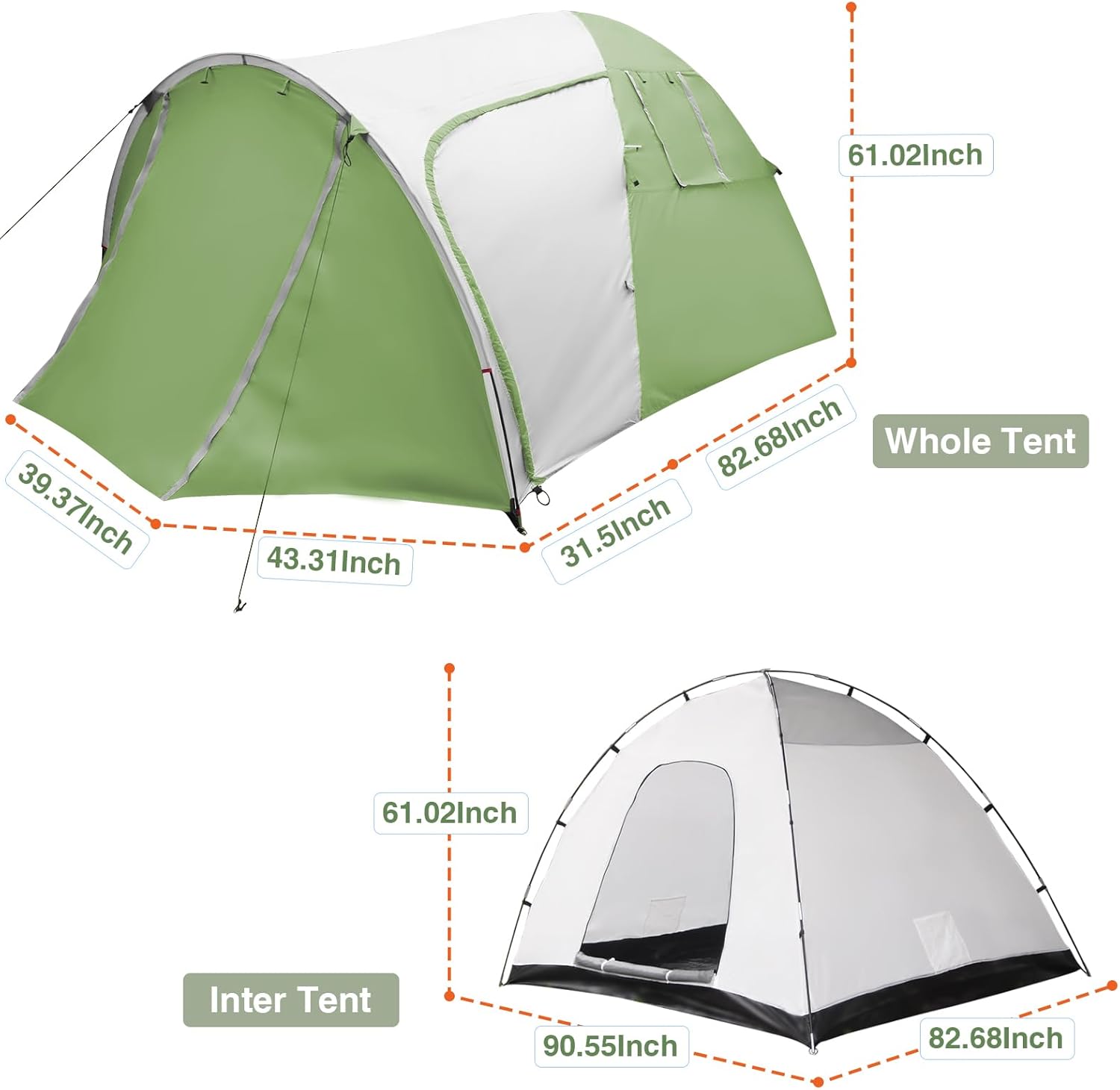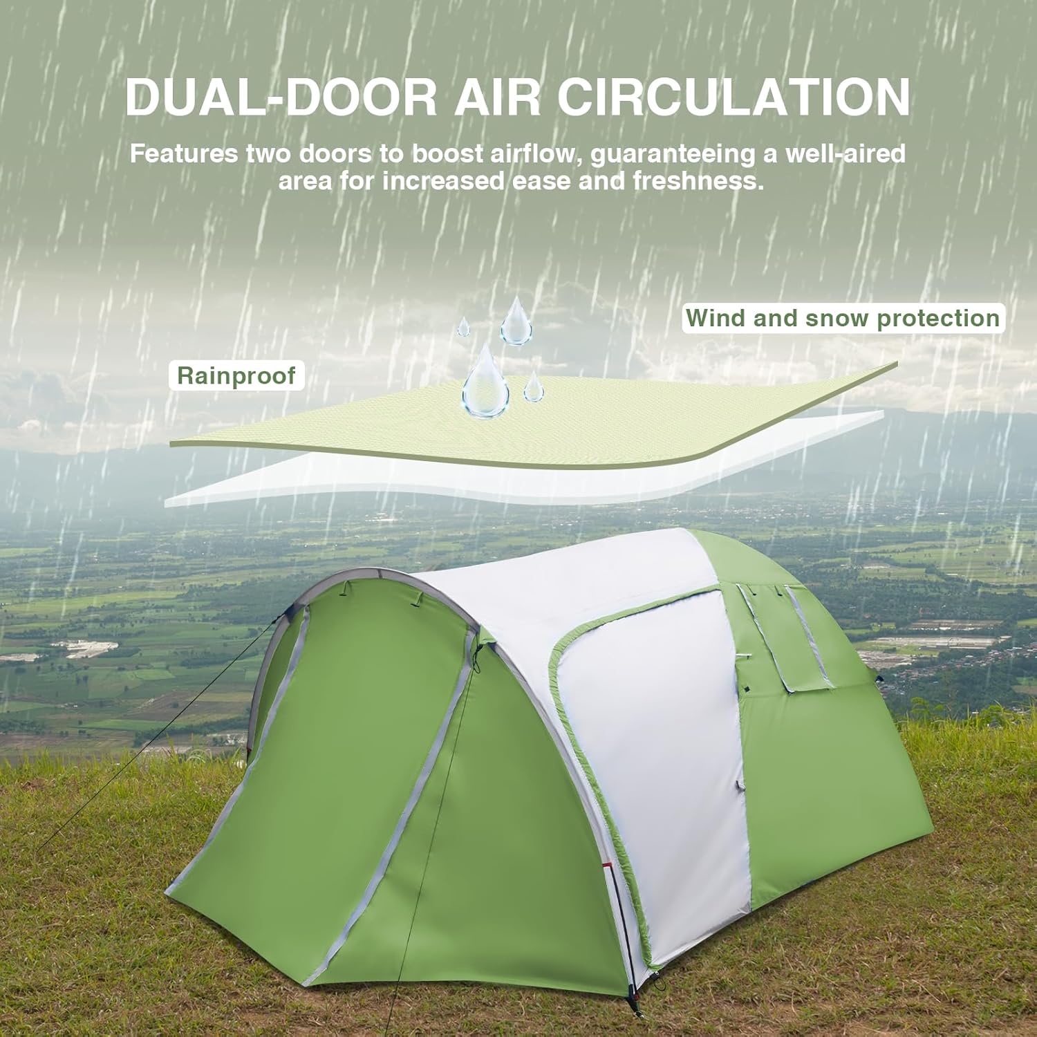 【Dual Doors and Windows for Ventilation】: Features two doors and two windows to ensure excellent air circulation in this camping tent 4 person, reducing humidity and heat for increased comfort during tent camping.
