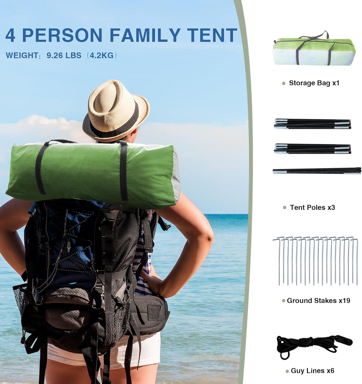 【Lightweight and Portable, Weighing Only 9.26 Pounds】: The lightweight design of this 4 person tent makes it easy to carry and transport, ideal for hiking and backpacking, easing the load for those who need tents for camping easy set up.