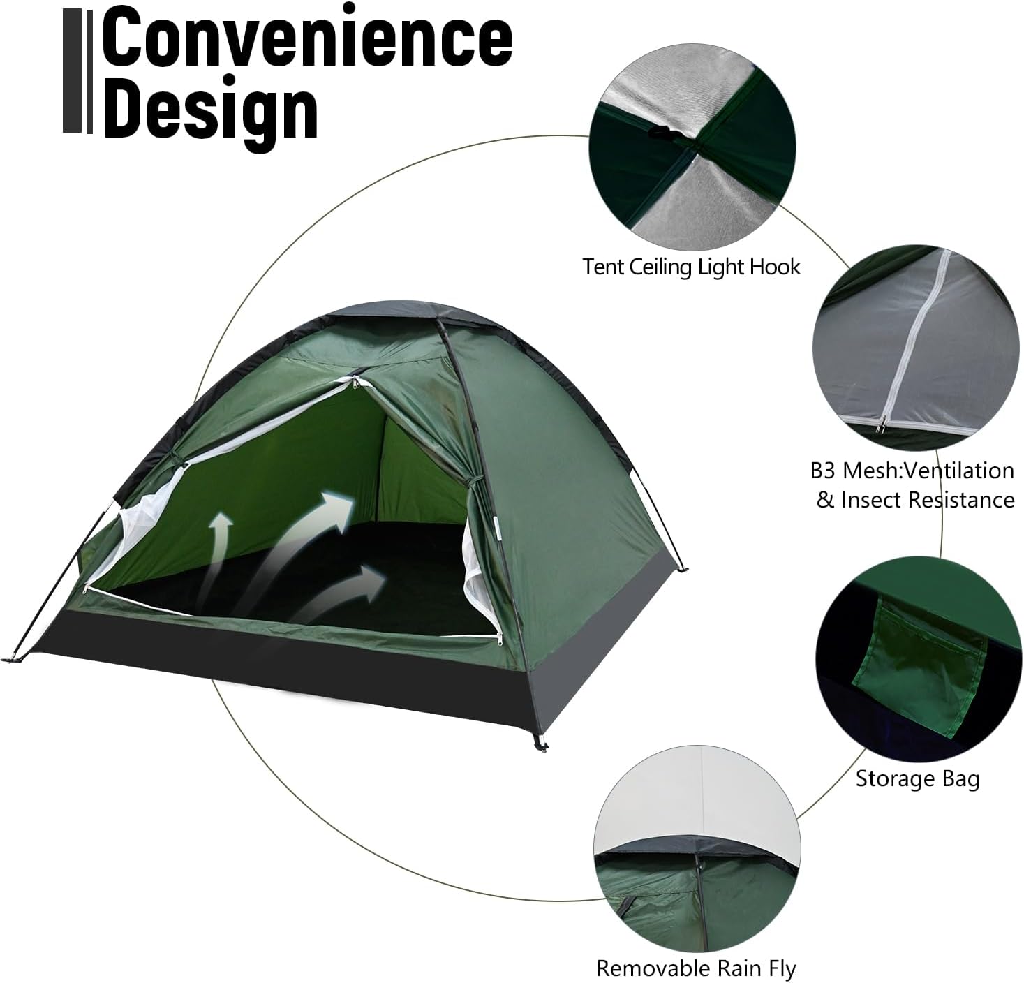 🌟Good Ventilation Design: The top of camping tent adopts a double-layer design, with an internal anti-mosquito breathable curtain and a removable external rain curtain; the front door is equipped with a two-way zipper mesh door for easy entry and exit.The backpacking tents for camping are equipped with mesh panels and windows. to allow air to flow freely while keeping bugs and insects out.