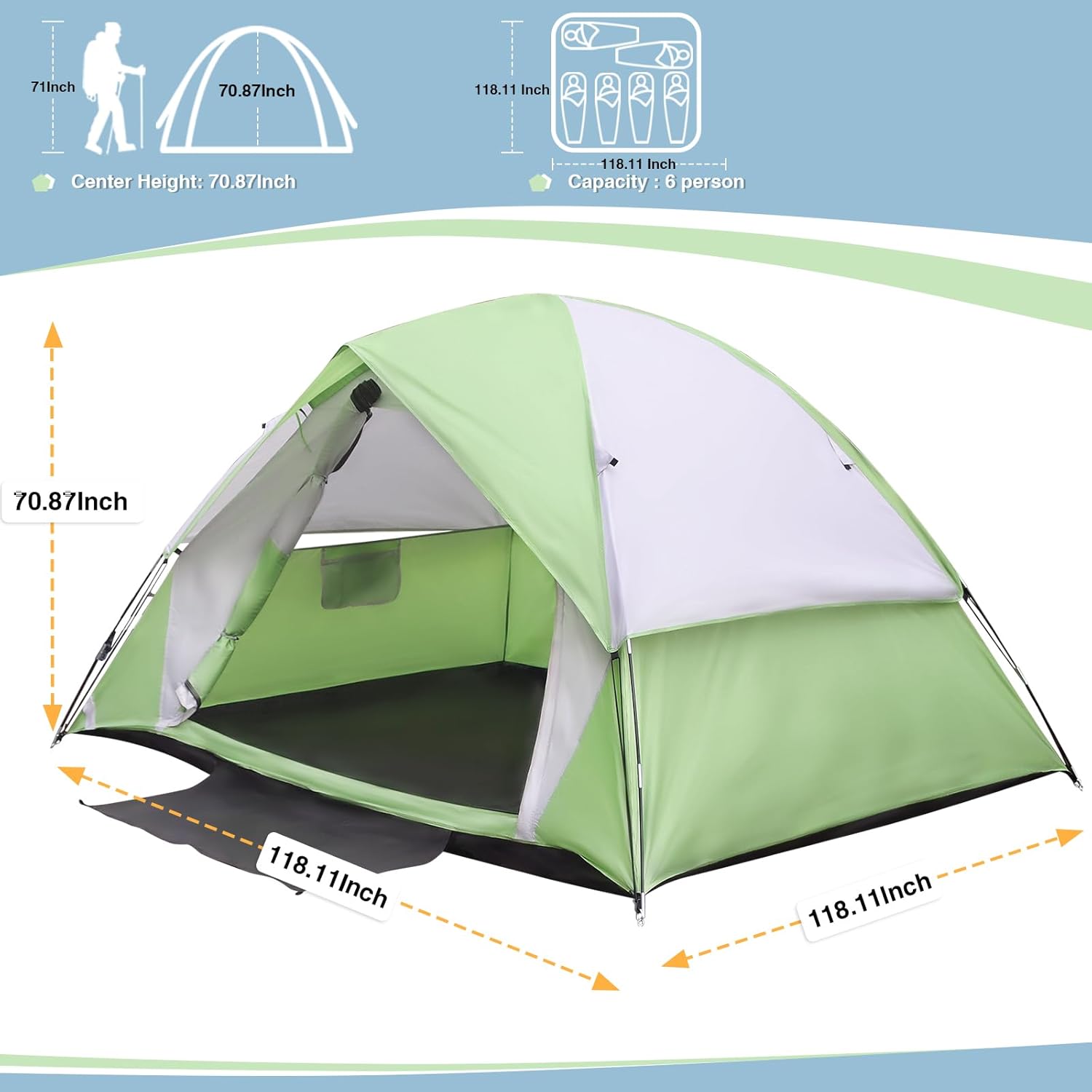 ⛺ Spacious Family Camping Tent: The versatile double-layer camping tent provides ample space for 6 people to move around,The tent unfolds to 10FTx10FTx6foot.The center height:6 foot,provides more headroom.This roomy camping tent offering comfort, freedom and space for 6 adults,families or groups of friends during camping trips.