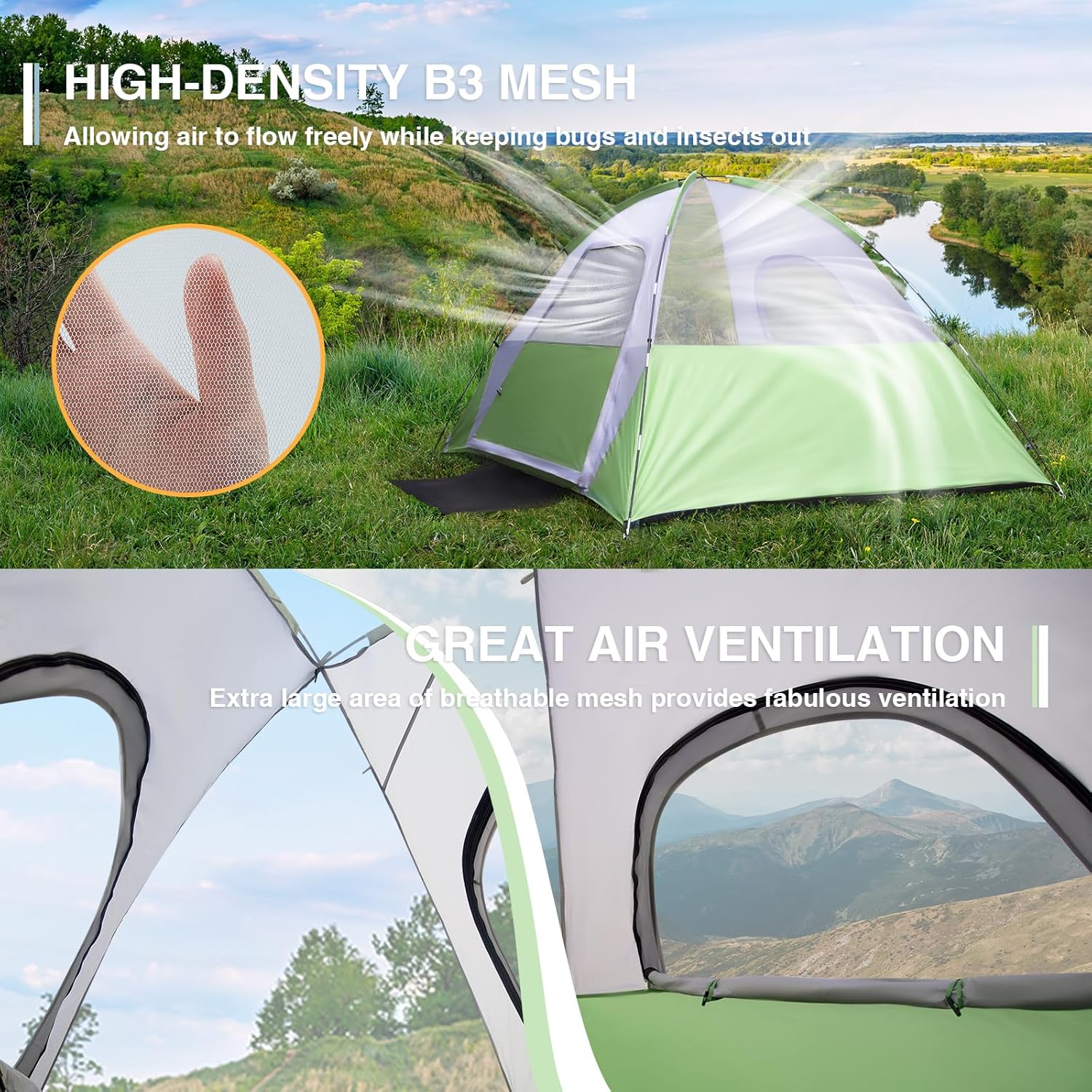 ⛺ Ventilation Excellence & Panoramic Views:This camping tent combines ventilation,ease of entry and exit,providing options Views. Doors with a D-shaped design for easy entry and exit.This inner layers tent features placed B3 mesh panels and large windows for immersive views of your surroundings,providing optimal airflow and preventing that stuffy feeling while camping.Ventilated mesh windows are both breathable and keep bugs out.