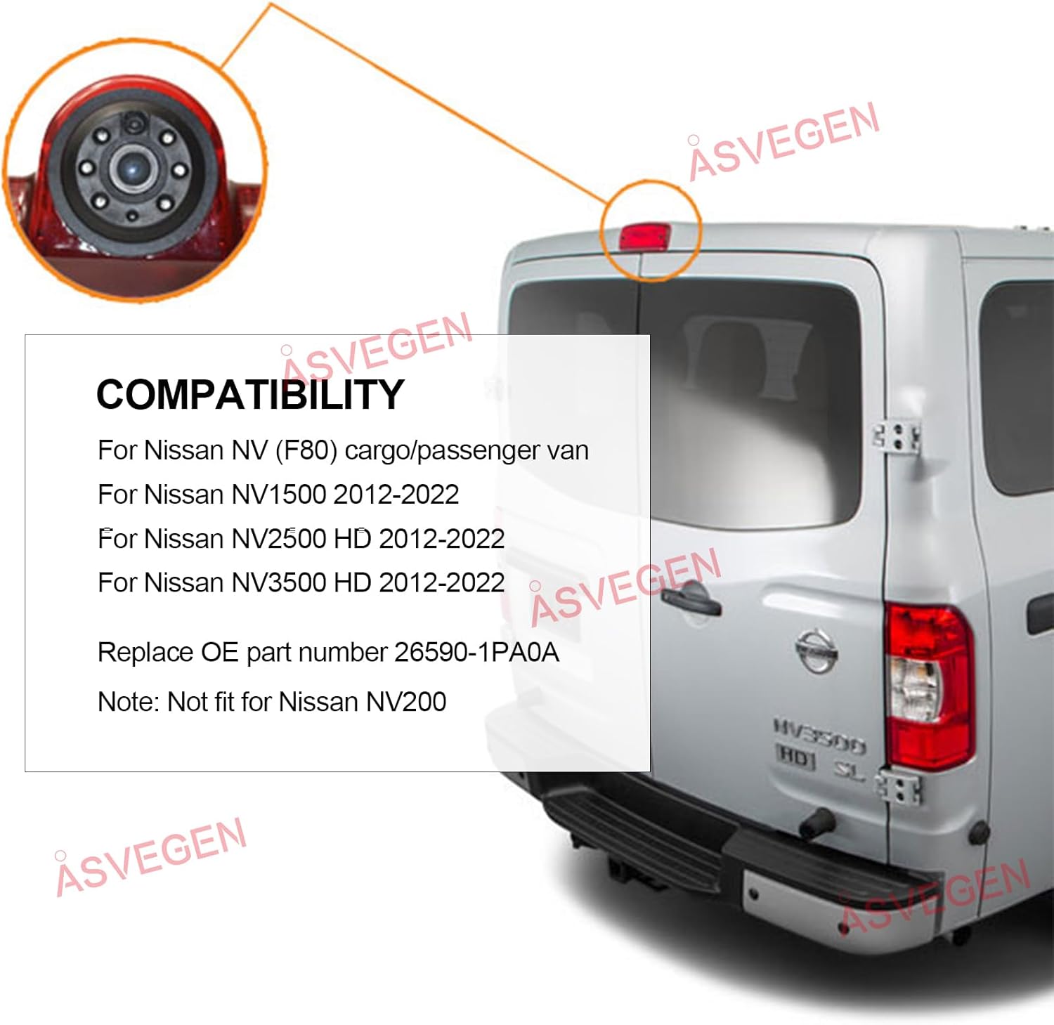 High roof mount stop light reversing camera for Nissan NV (F80) Cargo/Passenger Van, NV1500, NV2500 HD, NV3500 HD 2012-2022. Doesn’t fit for nissan NV200. Replace OE part number 26590-1PA0A.