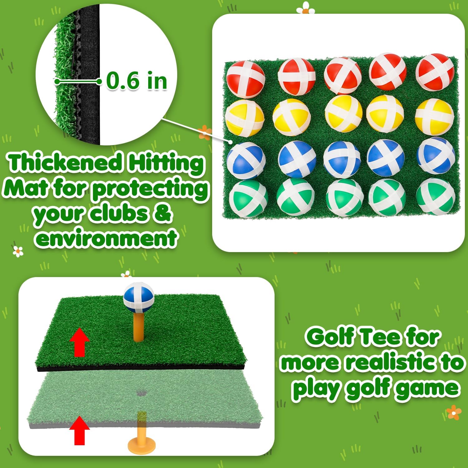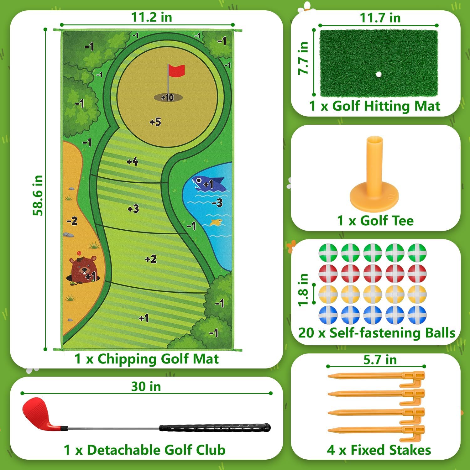 【Ultimate Golf Chipping Mat & Sticky Balls Combo】: Catering to youngsters aged 6-12 and adults at every skil l level, our comprehensive chipping golf mat set is a game-changer. Included in the package is an expansive mat, measuring roughly 5 ft in length and 1 ft in width, 20 adhesive balls, 4 ground stakes, 1 golf tee, 1 easily detachable golf club, and an additional golf hitting mat, ensuring you’re well equipped for an action-packed golfing adventure. (Golf clubs included.)