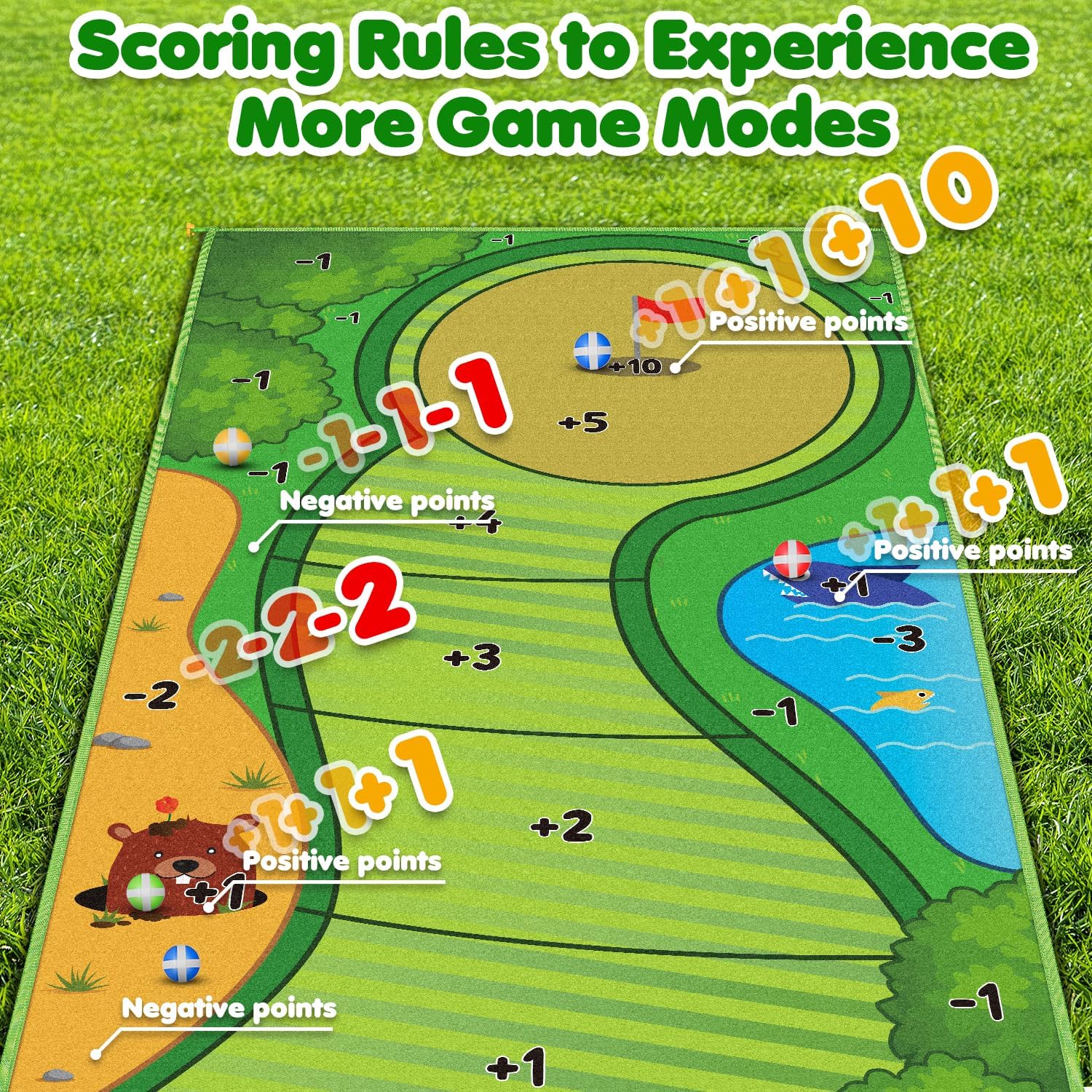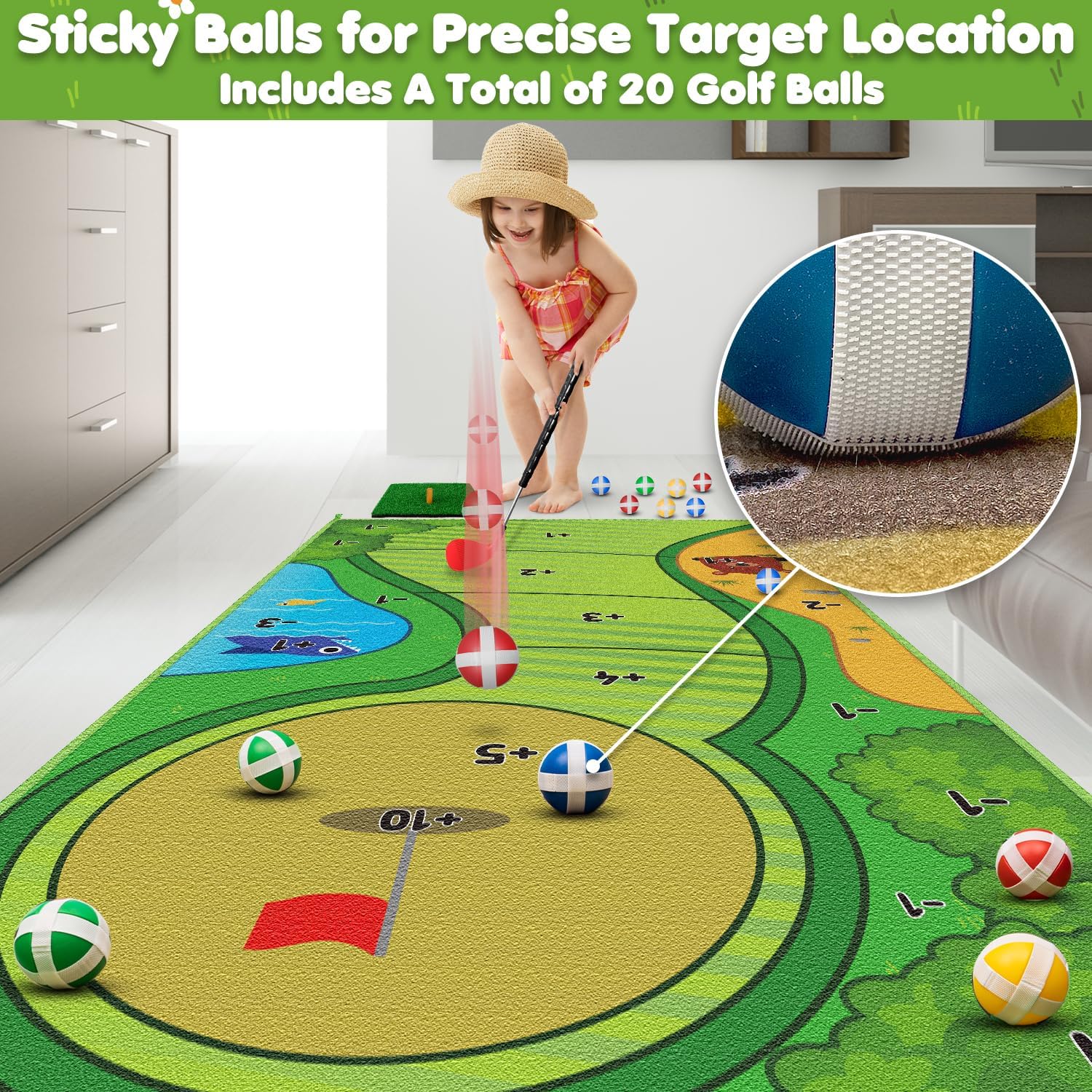 【Blend of Golf & Toss Fun】: Our multifaceted chipping mat isn’t limited to a golfing experience; it effortlessly transitions into a toss game toy. It’s compact and easy to store, and its intuitive design allows kids to set it up independently. The mat, crafted from robust fabric and sticky material, mimics a lifelike putting green, whereas the soft yet accurate balls ensure indoor safety.