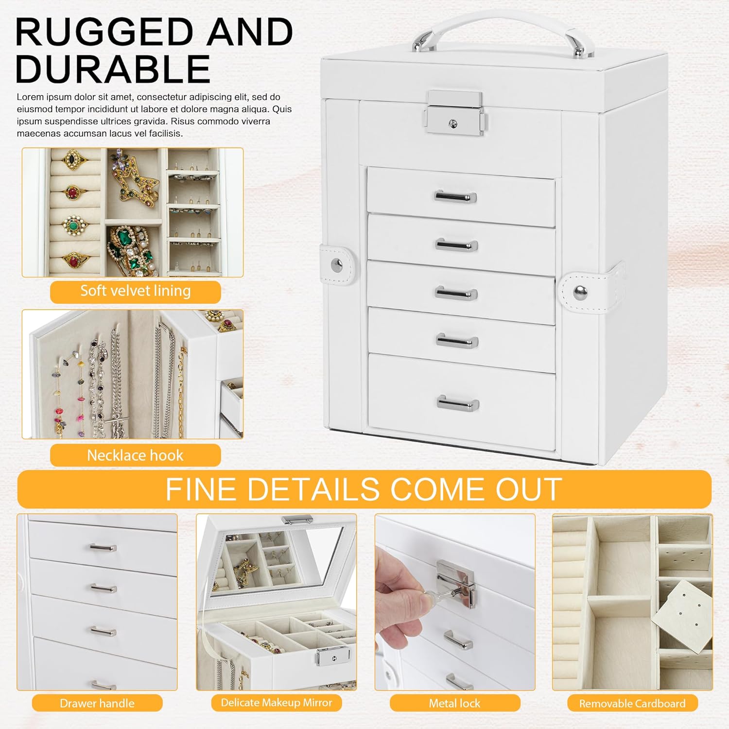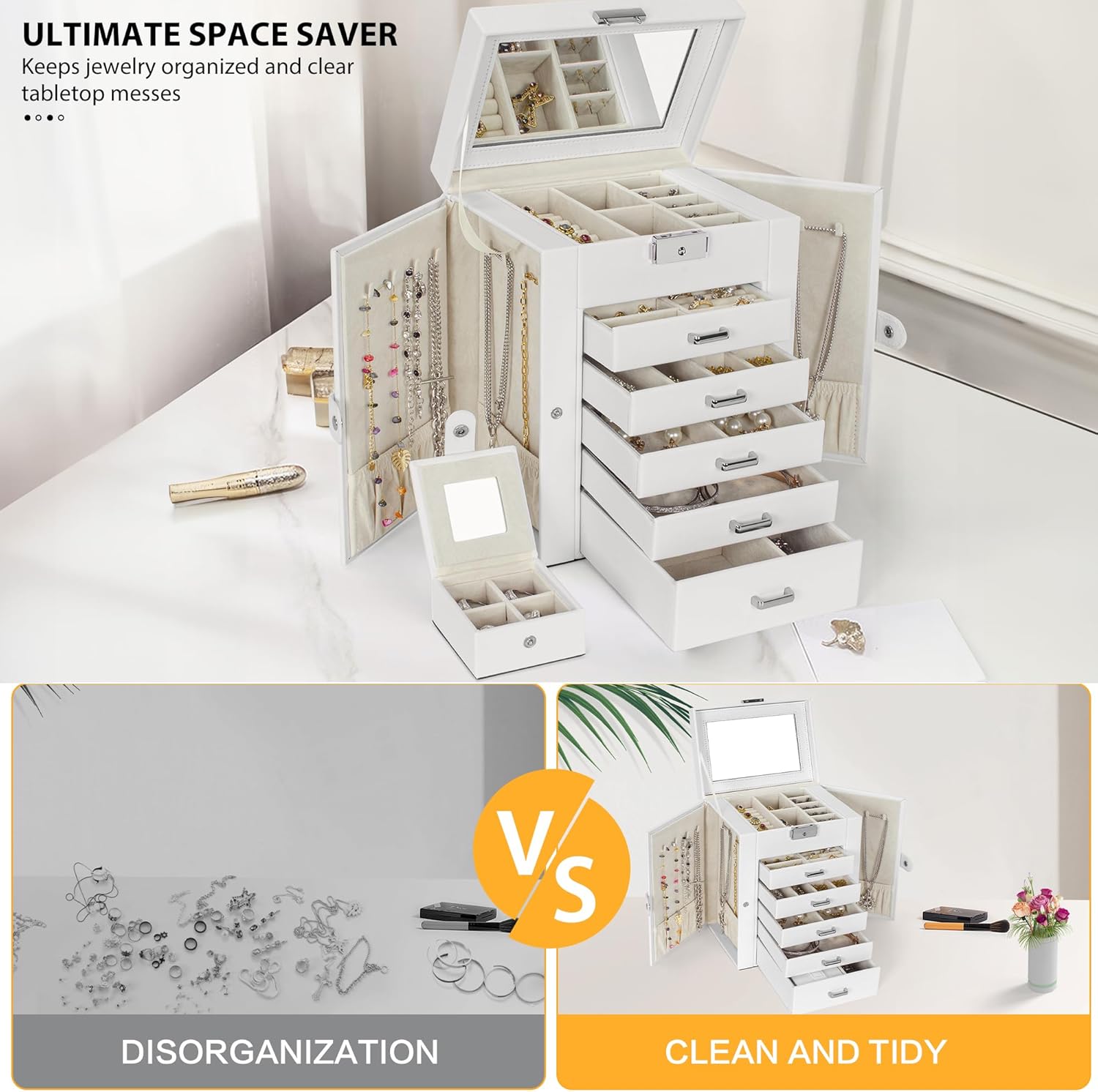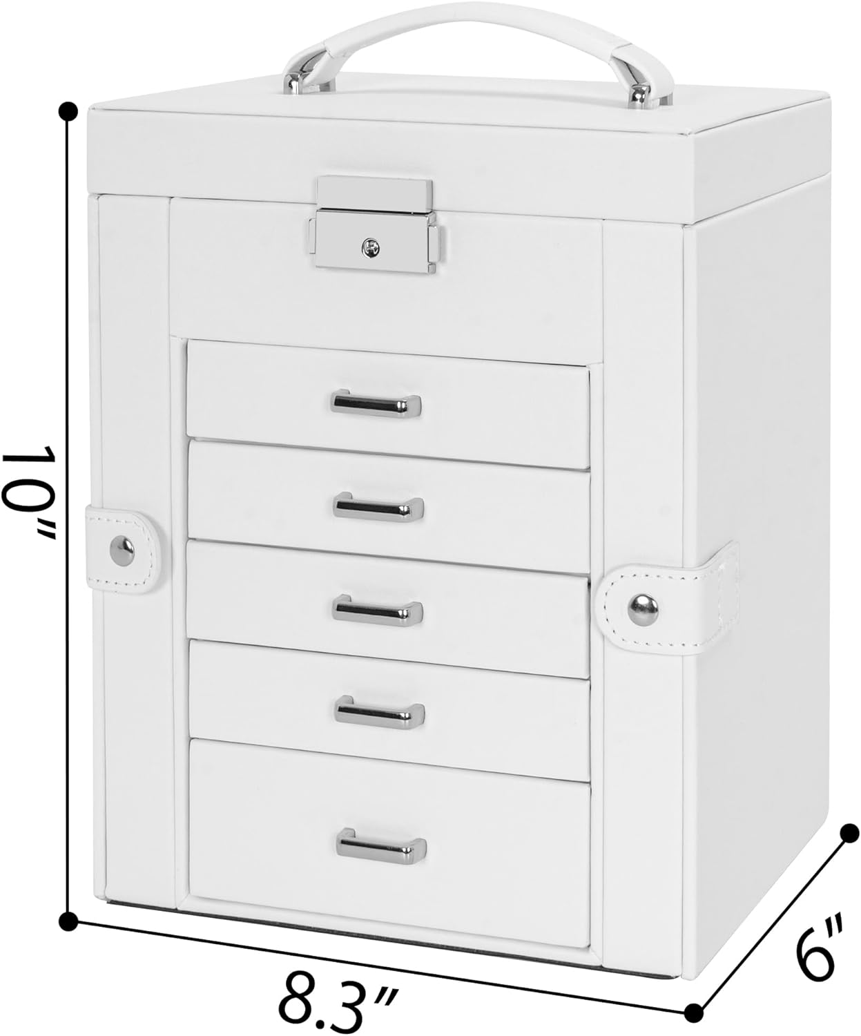 💍【6 Layers, Large Capacity】: 8.3″x 6″ x 10″. This jewelry box has different storage space, 5 drawers, you can put all your jewelry in neatly. Such as rings, bracelets, earrings, brooches and other jewelry. Even small accessories such as hairpins can be put in and sorted in an orderly manner, making your dresser desktop more tidy and saving space.