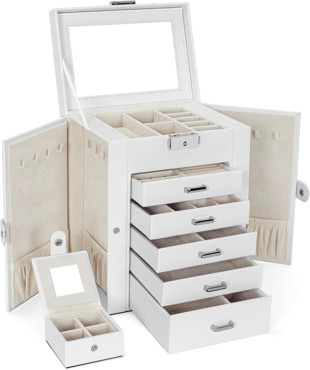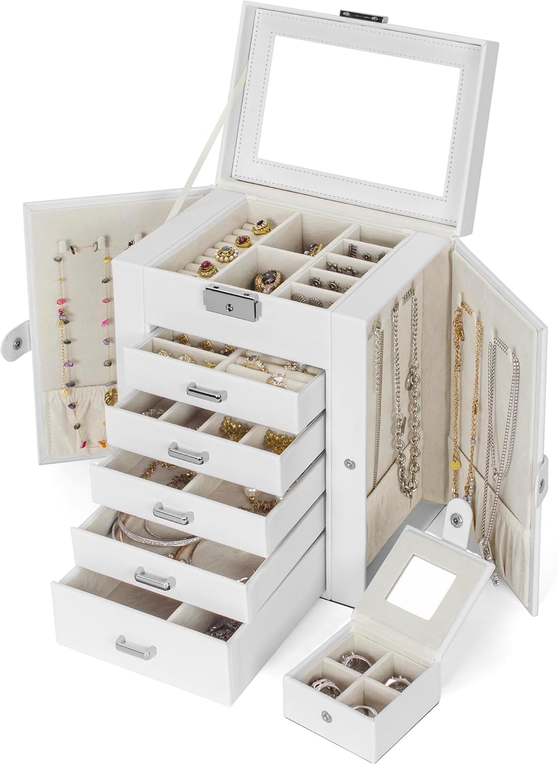 TORIBIO Jewelry Box Jewelry Organizer with Mirror, Faux Leather Jewelry Storage Case for Girls/Women/Mother, Necklace Earring Bracelets Holder Organizer, White