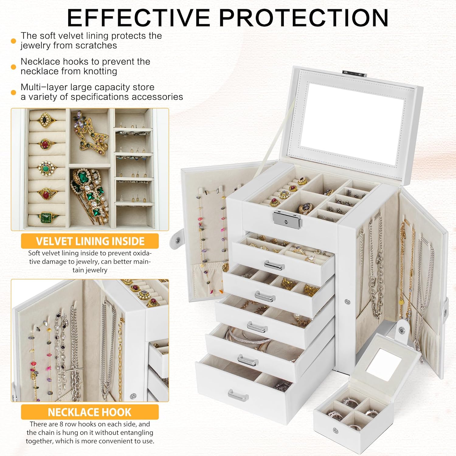 💄【With Inner Mirror & Lock】: There is a mirror on the top layer of the jewelry box organizer, which allows you to do makeup and check makeup at the same time, especially when you go out to work or on an appointment in the morning, saving your precious time. The part of the uppermost layer close to the mirror can be locked with a lock. The lock above can put your valuables inside, which is more secure and prevents naughty children from playing with it at will.