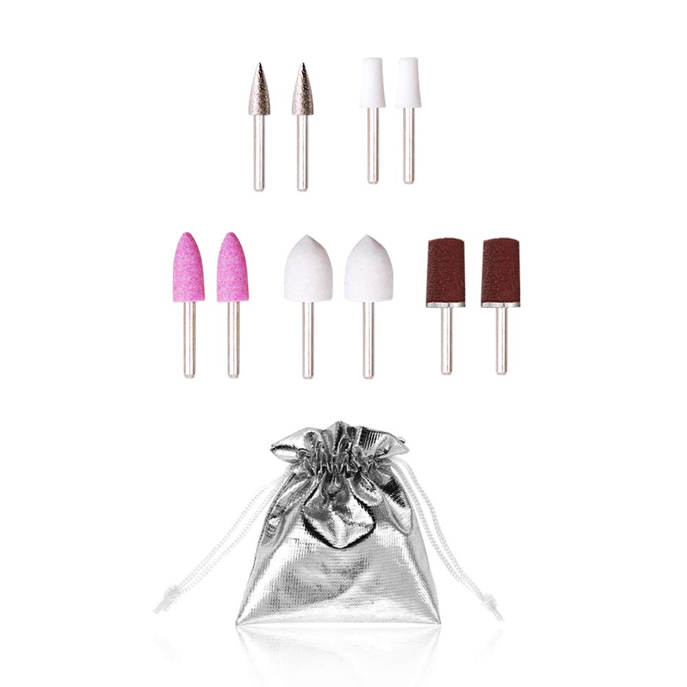 【10pcs Extra Replacement Nail Drill bits】2 x Sandpaper grinder, 2 x Chromium corundum grinder, 2 x White corundum grinder, 2 x Carborundum grinder, 2 x Felt grinder.