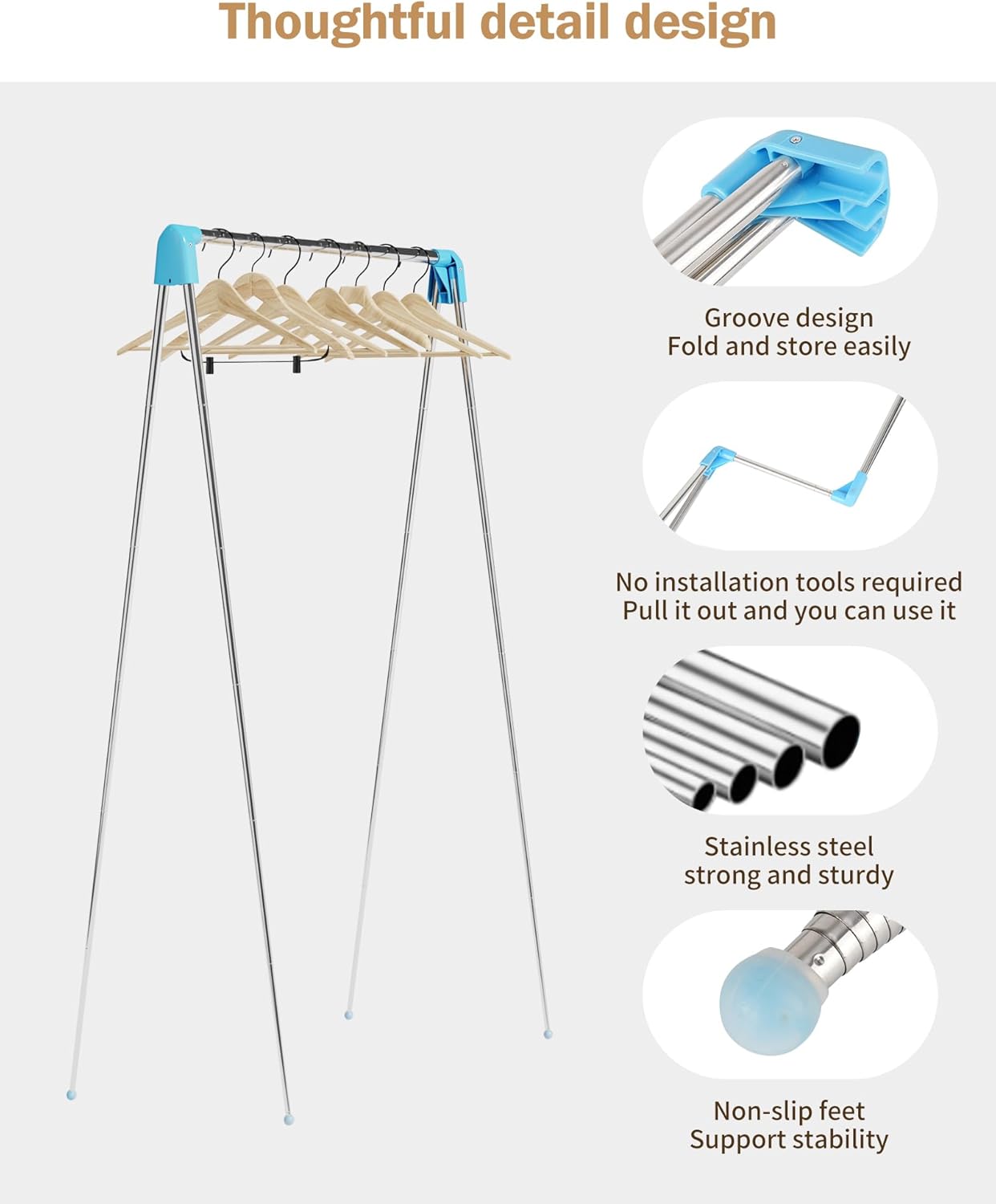 【No Installation】This foldable garment rack is telescopic design, no need to assemble, just unfold it quickly.This hanging clothes drying rack is made of high quality stainless steel with non-slip feet.