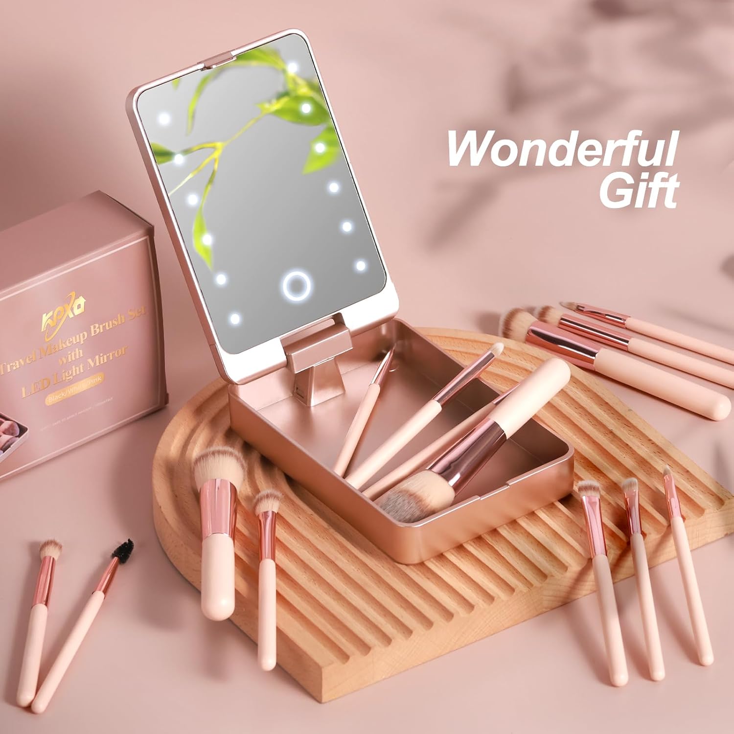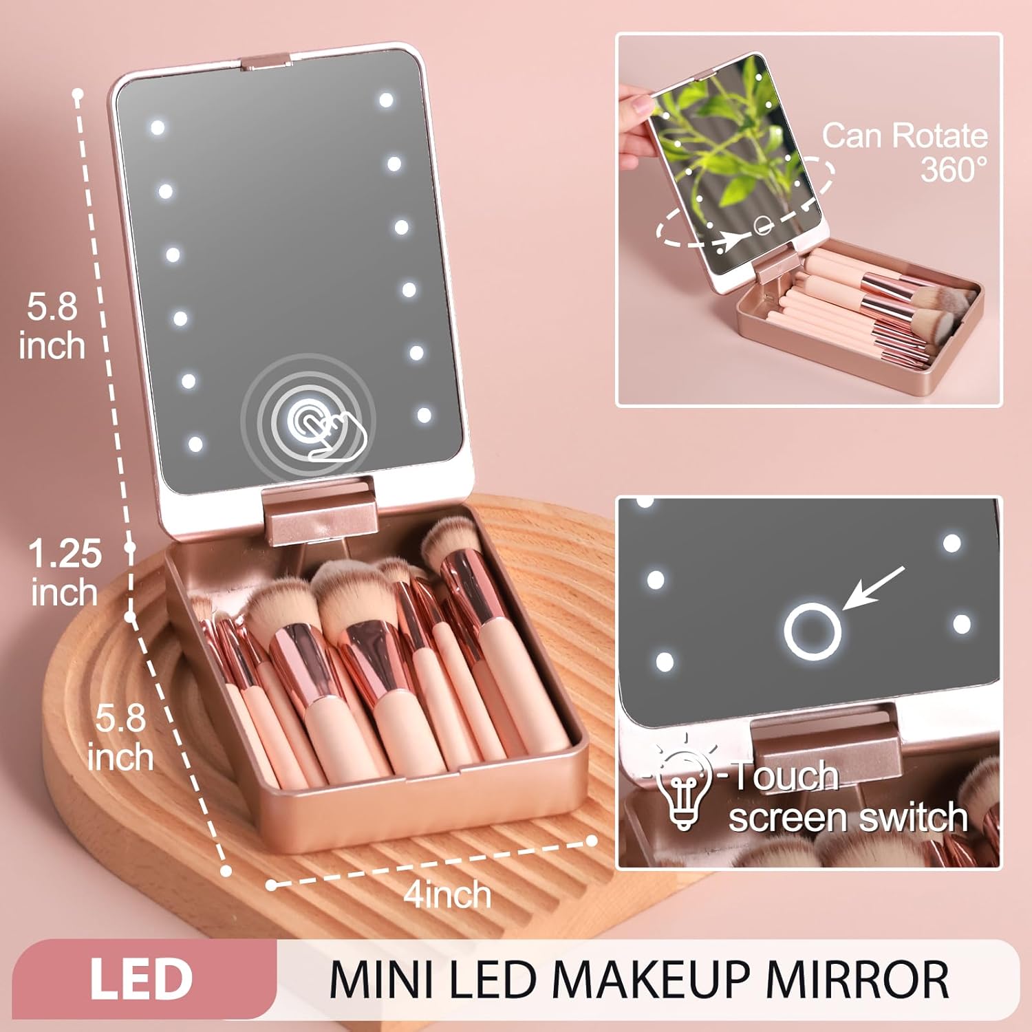 Travel Makeup Brush Set with LED Mirror, Professional and Mini Makeup Brushes Set 14Pcs, Eye Shadows Makeup Set Storage Box (Rose Gold)
