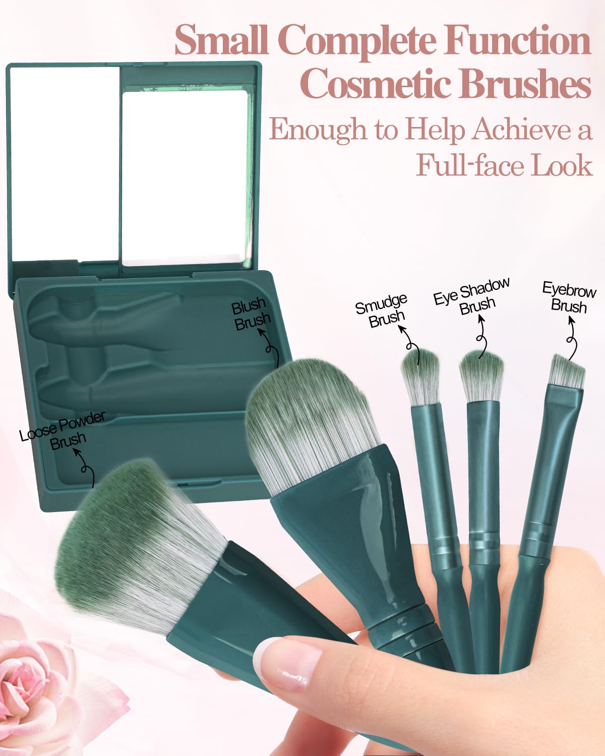 Travel Size Makeup Brushes Mini Set with Hard Case and Built-in Mirror, 5Pcs Small Cosmetic Brushes, On the Go Brush Travel Essentials kits for Women, Girls Gift (Dark Green)