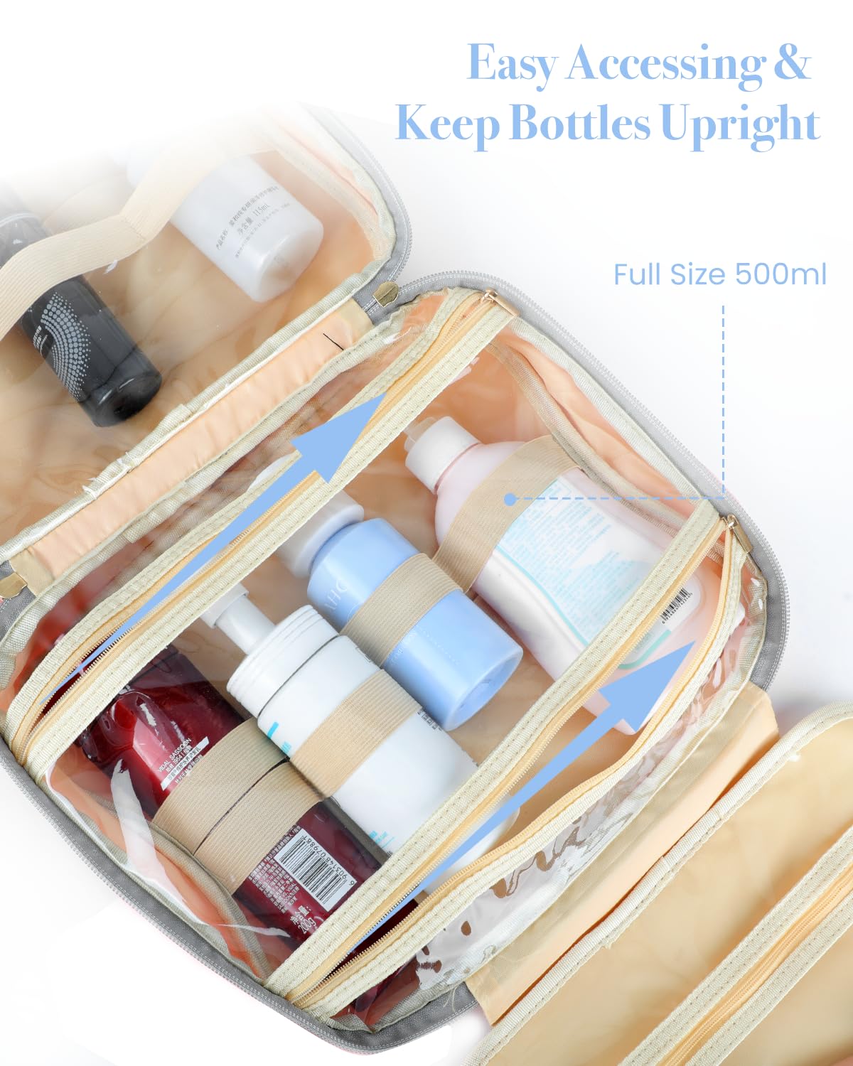 Spacious Compartments: 2 main large transparent compartments with elastic straps hold bottles upright, double zippers design for easier locate specific items and access. The top and bottom compartments are designed for organizing cosmetics, toiletries, makeup, jewelry, and other travel essentials in a compact, yet spacious manner.