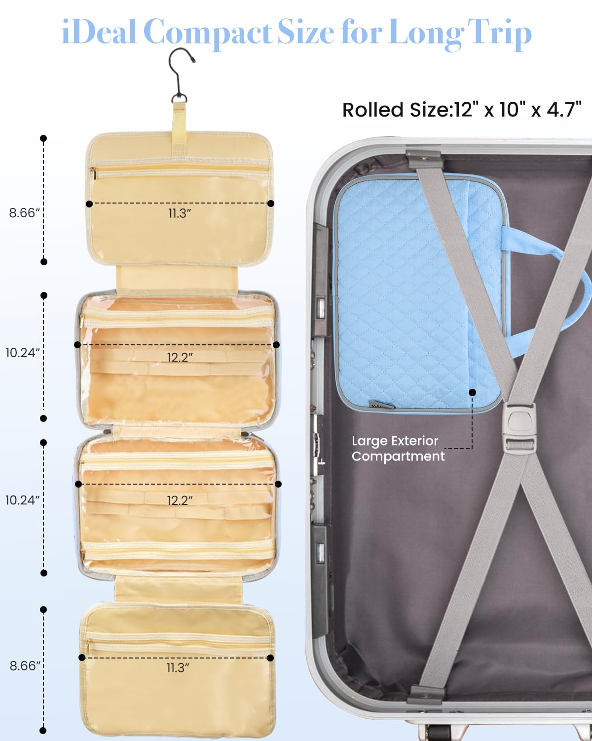 Large Capacity & Easily Fold up: 12.8 x 9.5 x 5.1 inch (rolled); 12.6 x 39.8 inch(open) 4 separate compartments with extra front zip pocket functionally organize your lotions, shampoo and any full-size toiletries. Designed with a much wider width, it makes our travel toiletry bag fold up easily even the bag is fully packed up.