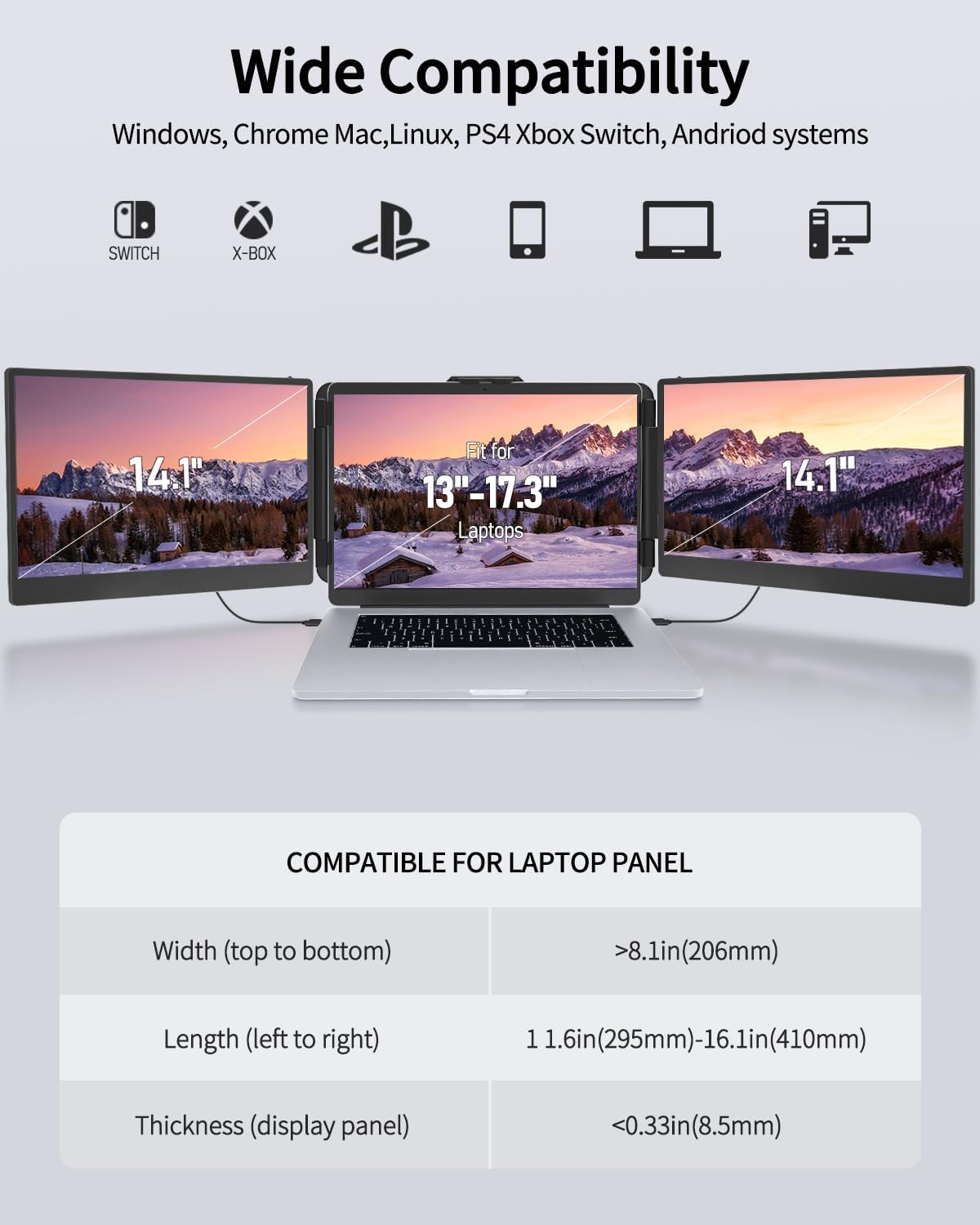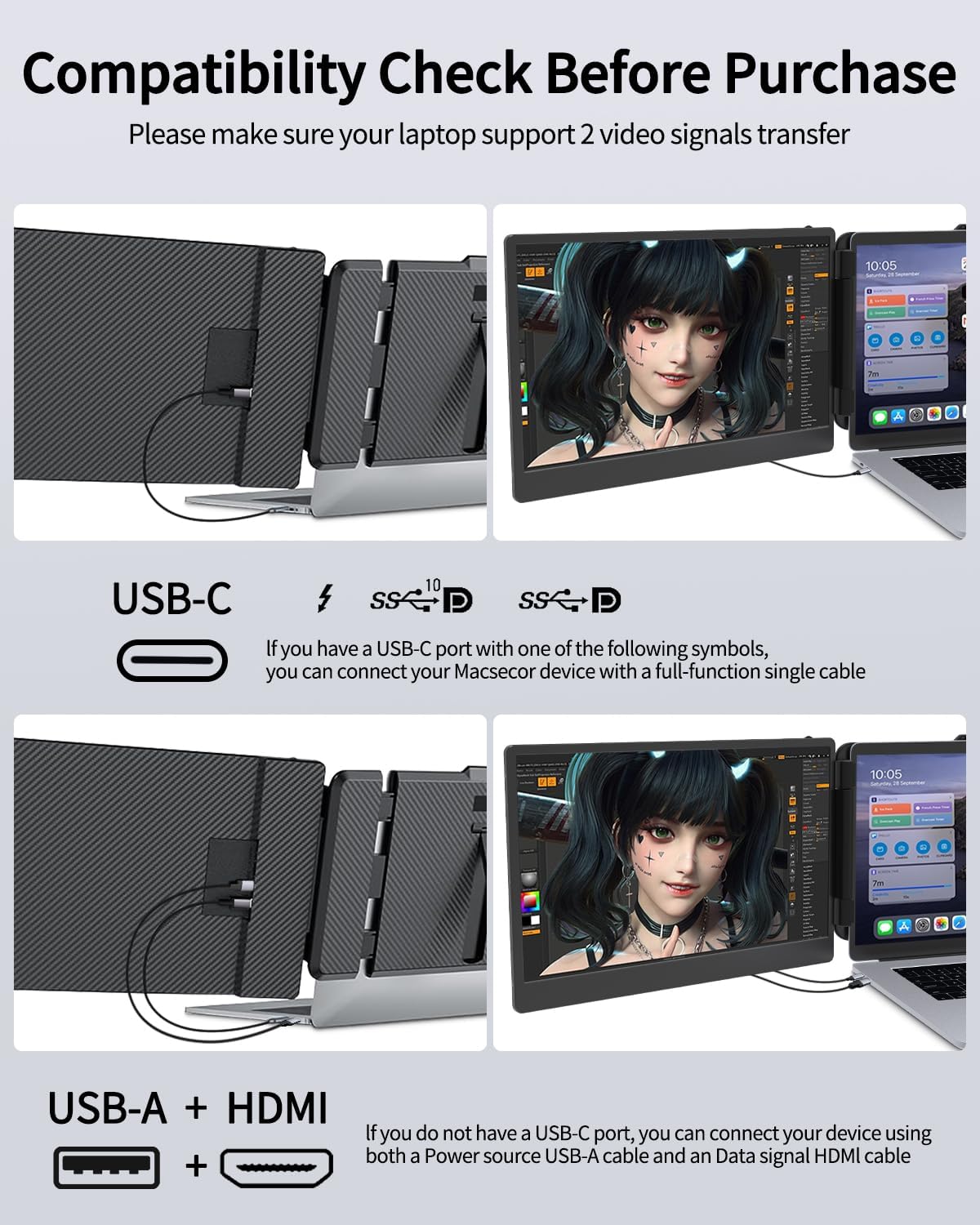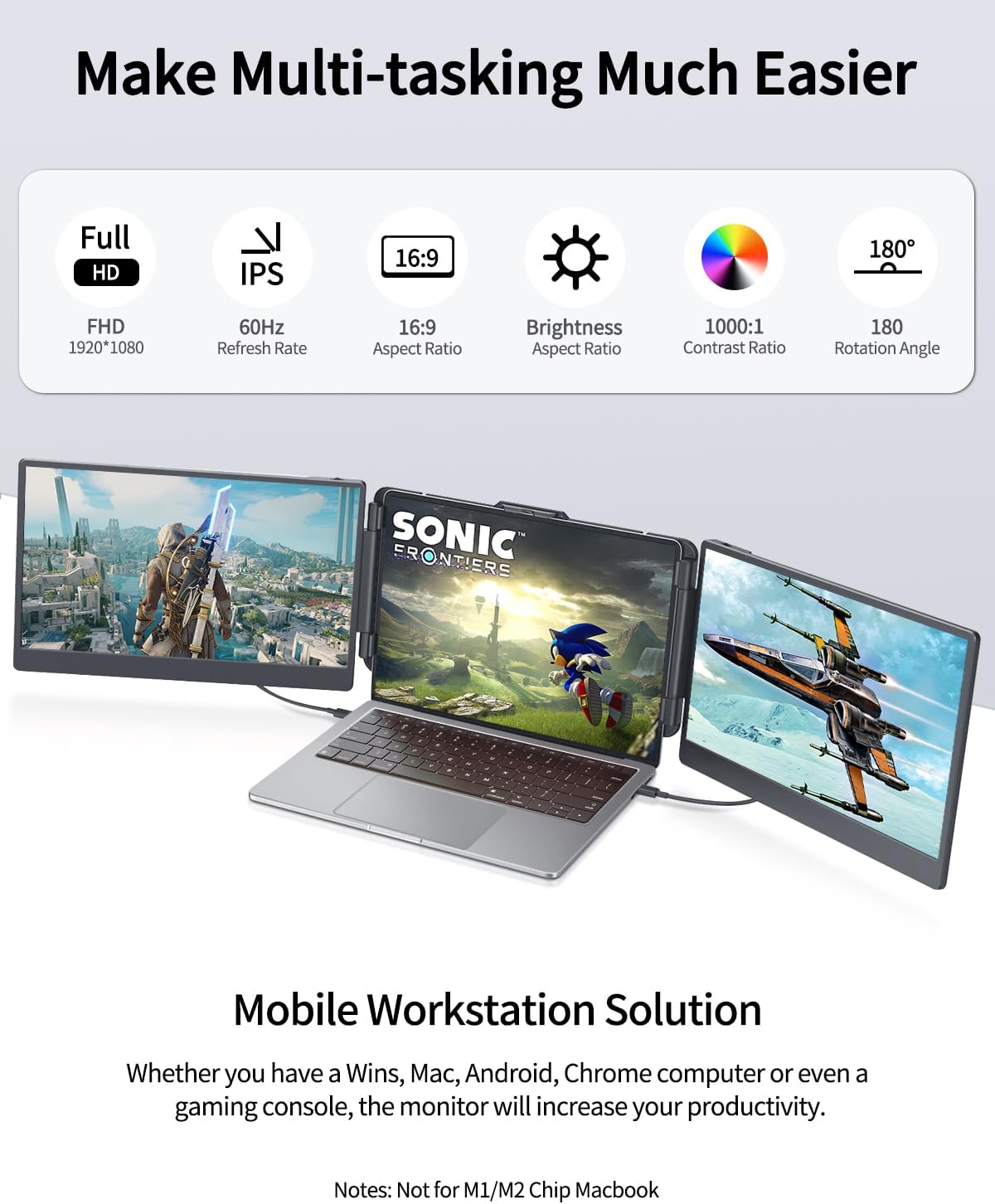 💝【Extensive Compatibility】Macsecor laptop monitor extender applicable for 13″-17.3″ laptops, compatible with Mac, Wins, Android, PC, Chrome, PS4, Xbox, & Switch systems. (Not for M1/M2 Chip Macbook). Simply connect the monitor to your device using the included cable Type-C/HDMI, easily achieve 1 screen to 3 screens workstation, plug & play, no driver needed.
