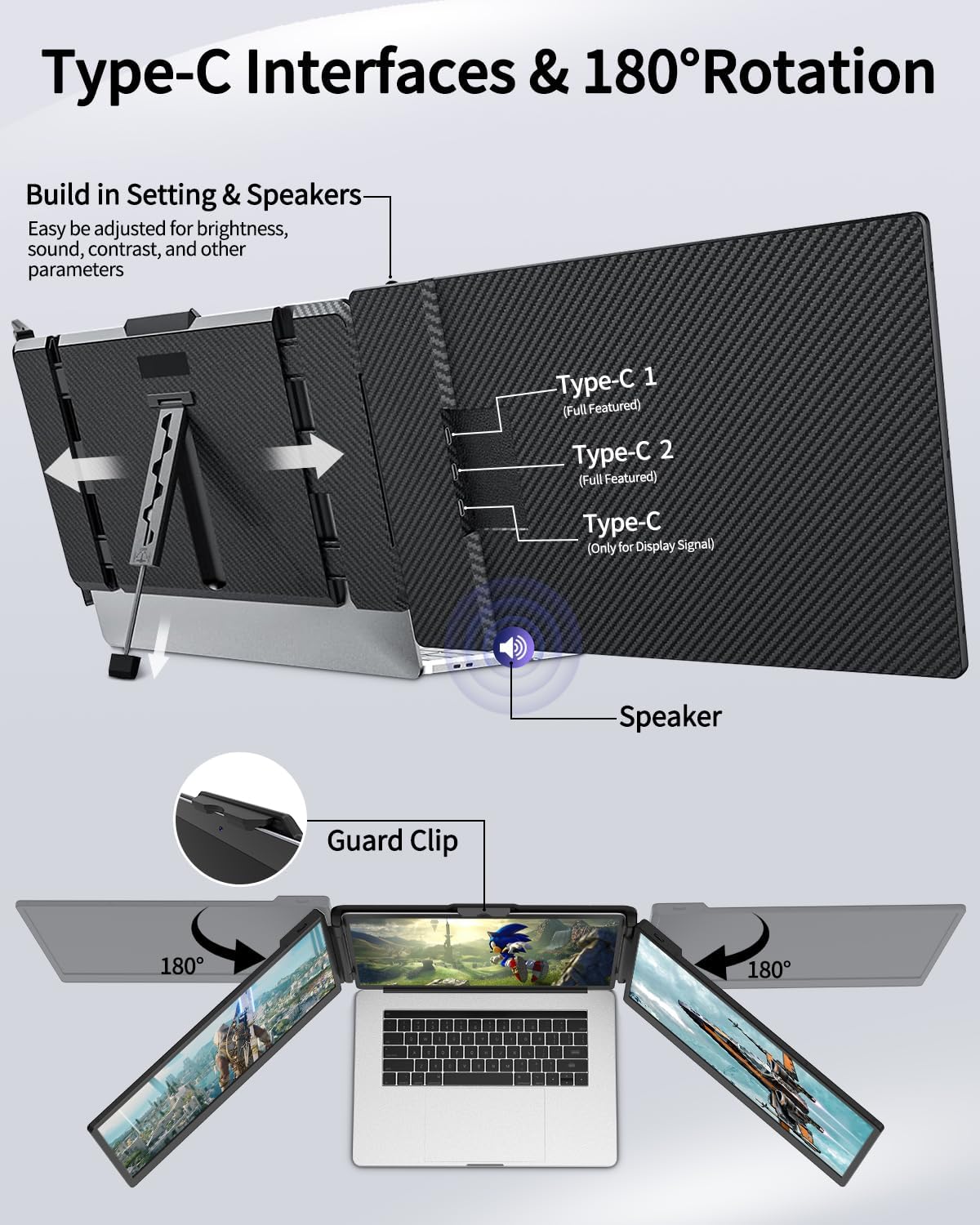 ⚙️【Easy to Use Design】Macsecor portable travel monitor features a 0.3 inch ultra-slim profile(3lb), can be easily put into the included bag, allows you to carry it everywhere. This triple portable monitor can be easily clamp onto the frame of laptops, comes with a stable built-in kickstand and each screen can be folded 0-180°, which you can adjust your favorite angle to work, even in public areas can protect your screen privacy.