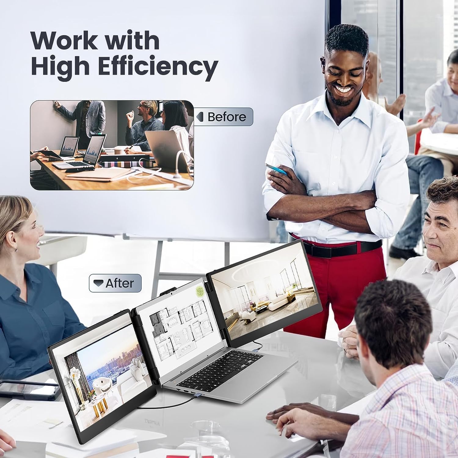 1.With a triple-screen setup, quickly builds a personal mobile triple screen portable laptop workstation for daily work and improves work efficiency by up to 300%.2.Triple portable monitor for laptop: Each screen is equipped with 2 USB-C ports and 1 HDMI port, and the thoughtful design makes the cable connection more beautiful!