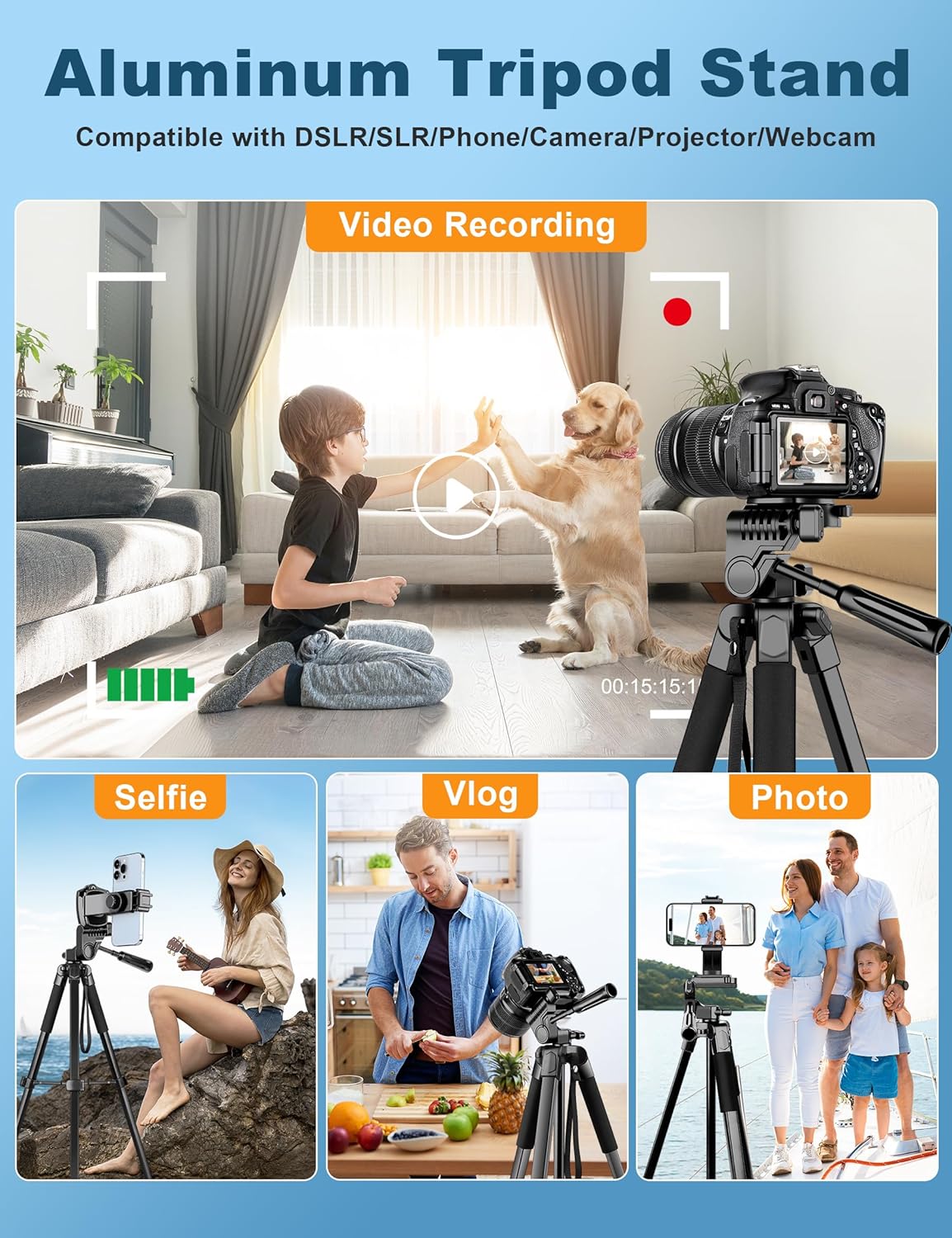 【Versatile Tripod with Remote】The camera tripod is equipped with wireless remote control, compatible with most iOS and Android smartphones (supporting a distance of 10 m / 33 ft), you don’t need to touch to start an easy selfie group photos filming recording vlogging streaming and steady tripod shots. Perfect for travel, trips, hiking, camping, parties, sports, skiing, surfing, YouTube, podcasts, Facebook, FaceTime, Instagram, and meetings, no matter indoor or outdoor activities.