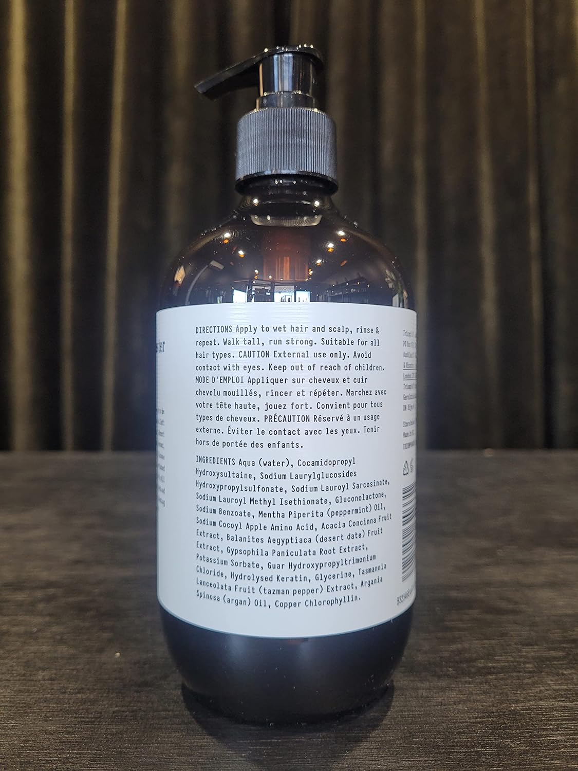 Aqua (Water), Coco-Glucoside, Glyceryl Oleate, Cocamidopropyl Betaine, Acacia Concinna Fruit Extract, Balanites Aegyptiaca (Desert Date) Fruit Extract, Gypsophila Paniculata Root Extract, Decyl Glucoside, Caprylyl/Capryl Glucoside, Hydroxyethycellolose, Sodium Cocoyl Apple Amino Acid, Gluconolactone, Sodium Benzoate, Tasmannia Lanceolata Fruit (Tazmen Pepper) Extract, Mentha Piperita (Peppermint) Oil, Hydrolysed Keratin, Argania Spinosa (Argan) Oil, Guar Hydroxypropyltrimonium Chloride, Sodium Citrate, Copper Chlorophyllin.