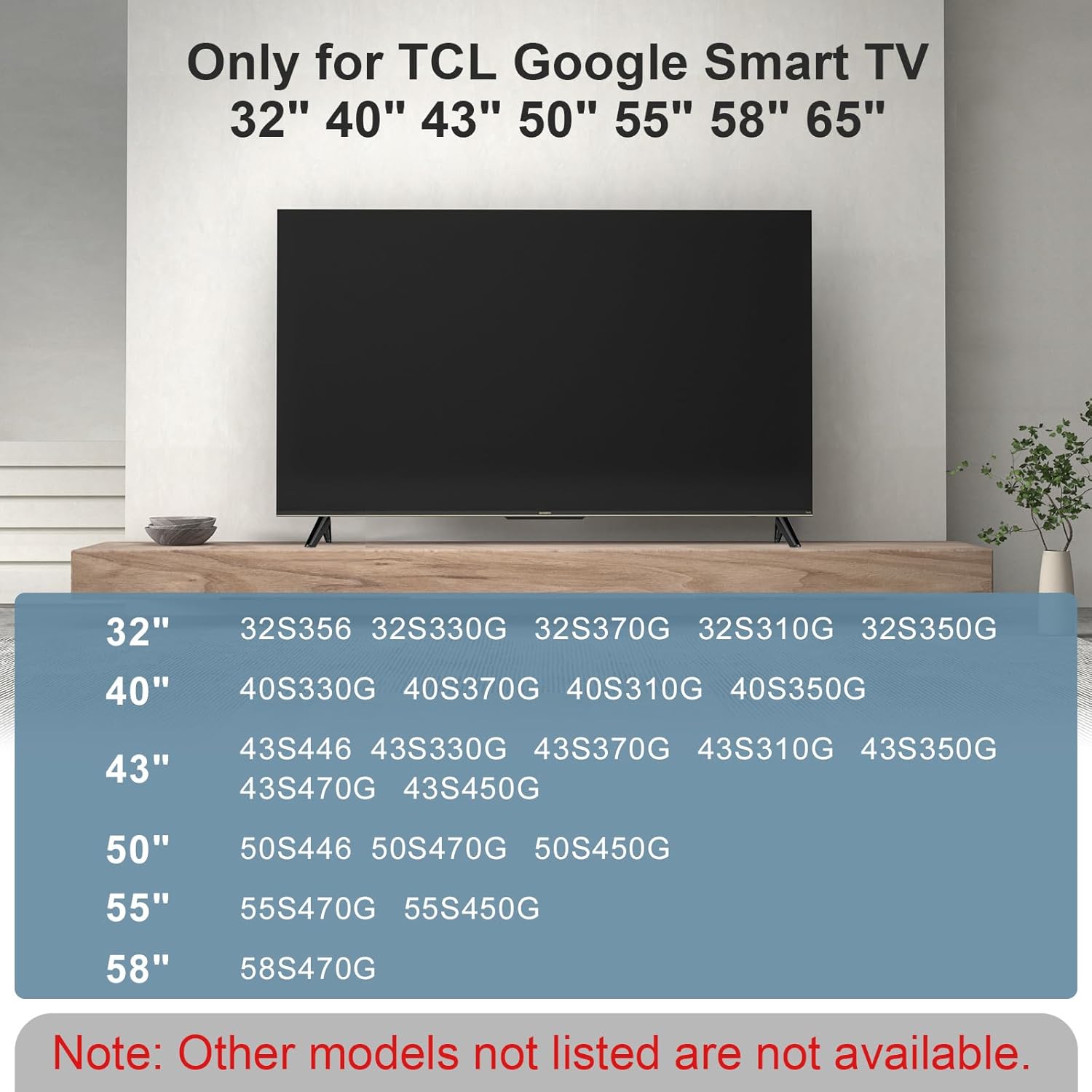 —-Compatibility—- Stand legs for TCL Google TV, for 32 inch, 40 inch , 43 inch, 50 inch, 55 inch, 58 inch, 65 inch TCL Smart Google TV, for 32inch : 32S356 32S330G 32S370G 32S310G 32S350G, for 40inch : 40S330G 40S370G 40S310G 40S350G, for 43inch: 43S446 43S330G 43S370G 43S310G 43S350G 43S470G 43S450G, for 50inch: 50S446 50S470G 50S450G, for 55inch: 55S470G 55S450G, for 58inch: 58S470G, for 65inch: 65S470G 65S450G.(Note: Other models not listed are not available.)