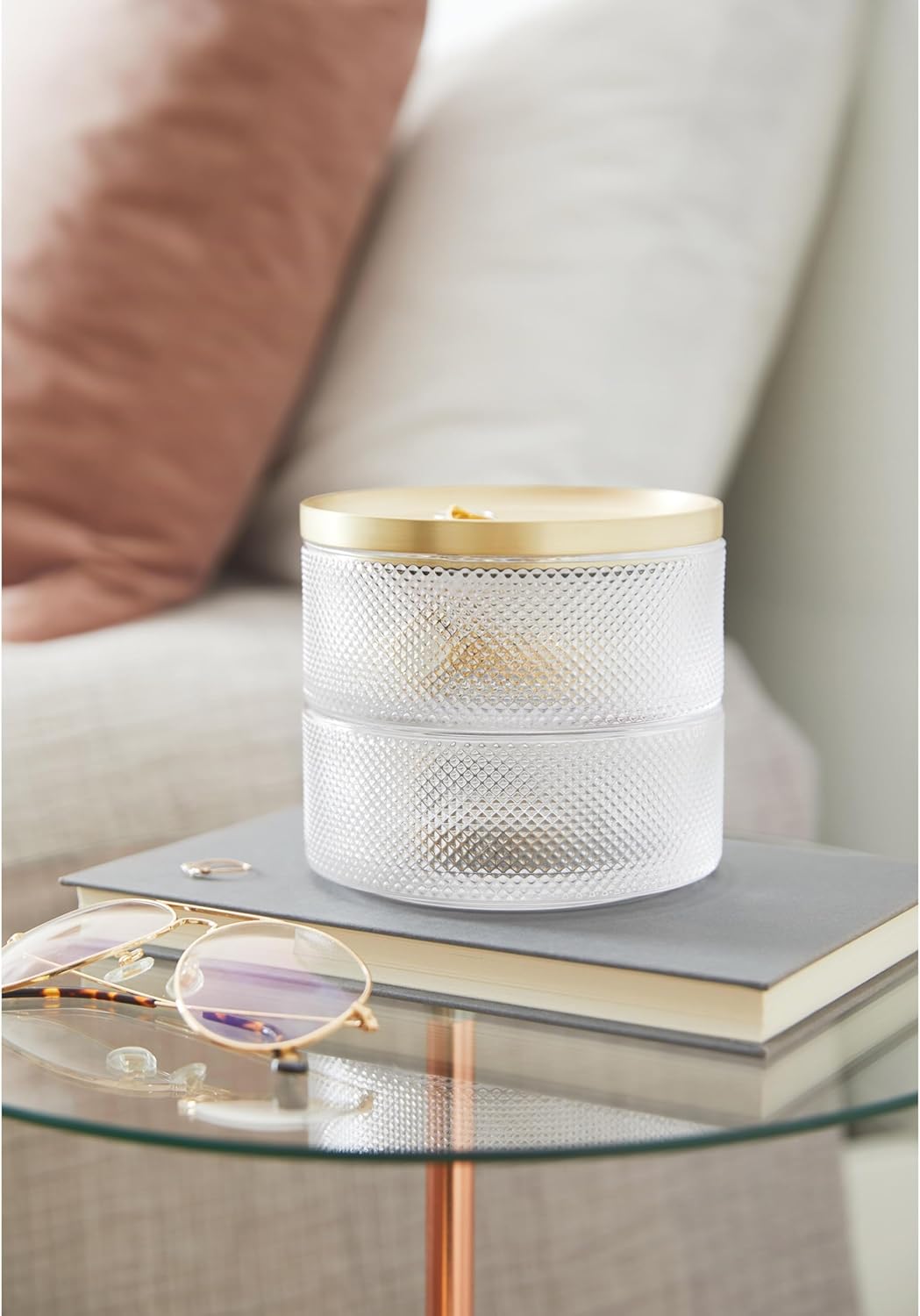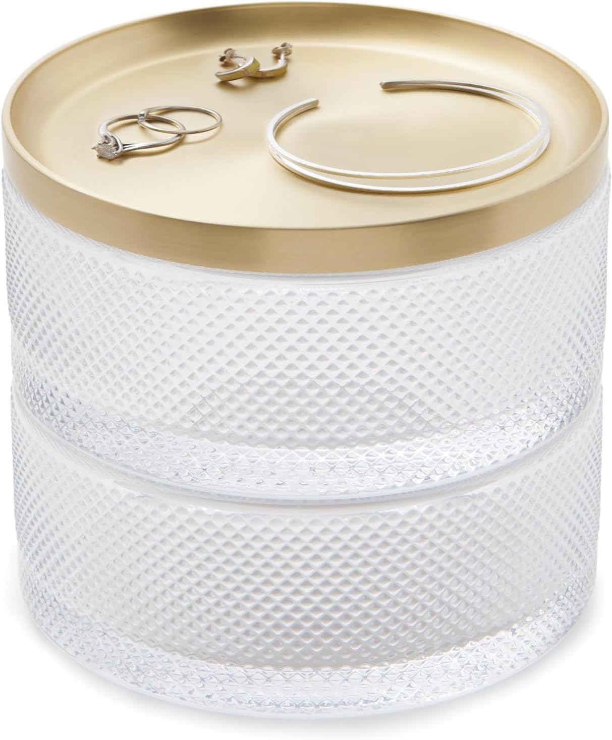 Finding the ideal storage solution that not only organizes but protects your jewelry from being lost or scratched, while keeping it easily accessible, can be a challenge – but not anymore! Introducing TESORA JEWELRY BOX from Umbra. Featuring two tiers that can be stacked or separated, this jewelry box is the perfect addition to help store and organize your accessory collection. The Tesora’s plated metal lid doubles as a tray to store and display easily accessible accessories. Its two-tiered stacking design makes this a versatile storage solution that can be stacked on top of one another to save room or kept separately. Its perfect size makes it easy to place by your bedside table for easy access and to ensure your jewelry does not get lost. Give your favorite jewelry and accessories a safe home by ordering the Tesoro Jewelry Box, Jewelry Organizer today. About Umbra: A global product design company providing original, modern, casual and functional design for the home.